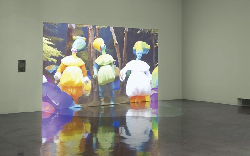 Kira Xonorika is a writer, theorist, and artist invested in using technology in acts of Indigenous future-making. In her essay “Do You Believe in Aliens? Re-Indigenizing the Algorithmic Tropes of Intelligence,” she charges the acronym AI with a new meaning, “Ancestral Intuition,” proposing to reIndigenize the future through a protocol of collaboration and interspecies communication. She works critically with AI software that is publicly available and accessible to artists with less resources, co-authoring with them flourishing worlds of hybridized natural and artificial life. Within our exhibition, Xonorika created a portal and origin story for an alternative future filled with two-spirit, interspecies beings. This newly commissioned video, Deep Time Dance (2024), was projected onto the wall and reflected in a watery installation that evoked the Guaraní creation myth of Tupã Tenondé, the creator of all life, and Mainumby, the hummingbird who nourished and inspired the deity while the world was being made.