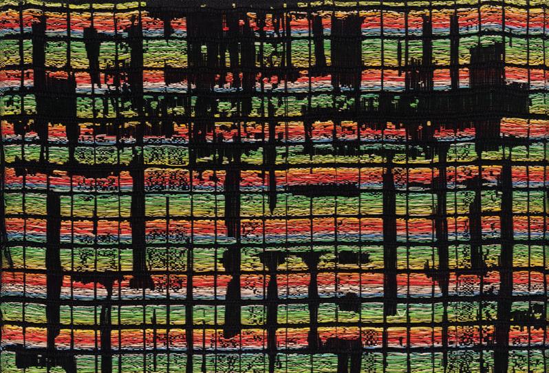 A descendant of Wixárika weavers, Sarah Rosalena contributes to this book an essay on her exploration of pixels, letters, and color—the most basic units through which algorithms function. Rosalena collaborates with her digital jacquard loom, combining programming code and hand-based techniques to interrupt the systems of code through which