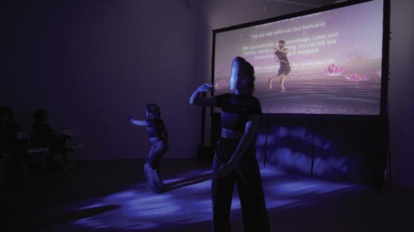The exhibition was grounded in the artistic practices of seven artists—Sarah Rosalena, Kira Xonorika, Stephanie Dinkins, Nora-Al Badri, Kite, Minne Atairu, and Charmaine Poh—plus the collective Interspecifics, and a collaboration between artists Mashinka Hakopian Firunts with Dahlia Elsayed and Andrew Demirjian. Based in different parts of the globe and spanning diverse backgrounds, these artists expand their practices into theory, education, curation, and critical writing. The performance series included The Body is the Interface, a one-night event with live works by Kite and Interspecifics; the acclaimed play The Shadow Whose Prey the Hunter Becomes by Back to Back Theatre, a work crafted and performed by neurodivergent actors; and the performance Prometheus Firebringer by Annie Dorsen, made with the predictive text model GPT-4. Manthia Diawara’s essay film AI: African Intelligence was a meditative moment on rituals, traditions, and AI; and we closed 2024 with Live Night: Cruising Bodies, Spirits, and Machines, a celebration of brown, queer, and trans artists through durational performances by MUXX and rafa esparza, and a DJ set with AI visual effects by Venezuelan artist and singer Arca. You will find in this collection essays, a conversation, a digital artwork, an excerpted artist book, as well as scripts and visual documentation that speak to the power of these artists and the paths they have paved forward for engaging with AI ethically and imaginatively.