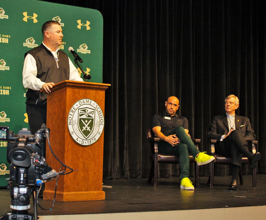 At the podium Brent Hill speaks at his introductory press conference Feb. 8 as Notre Dame director of communications Will Musto (center) and head of school Deacon Hicks Armor look on.