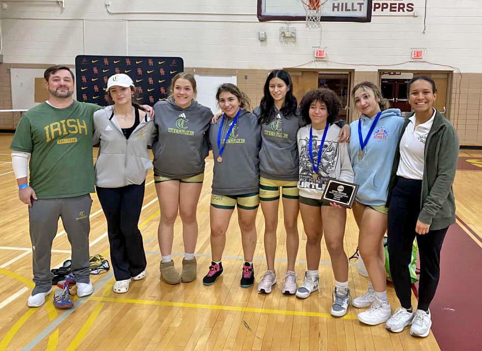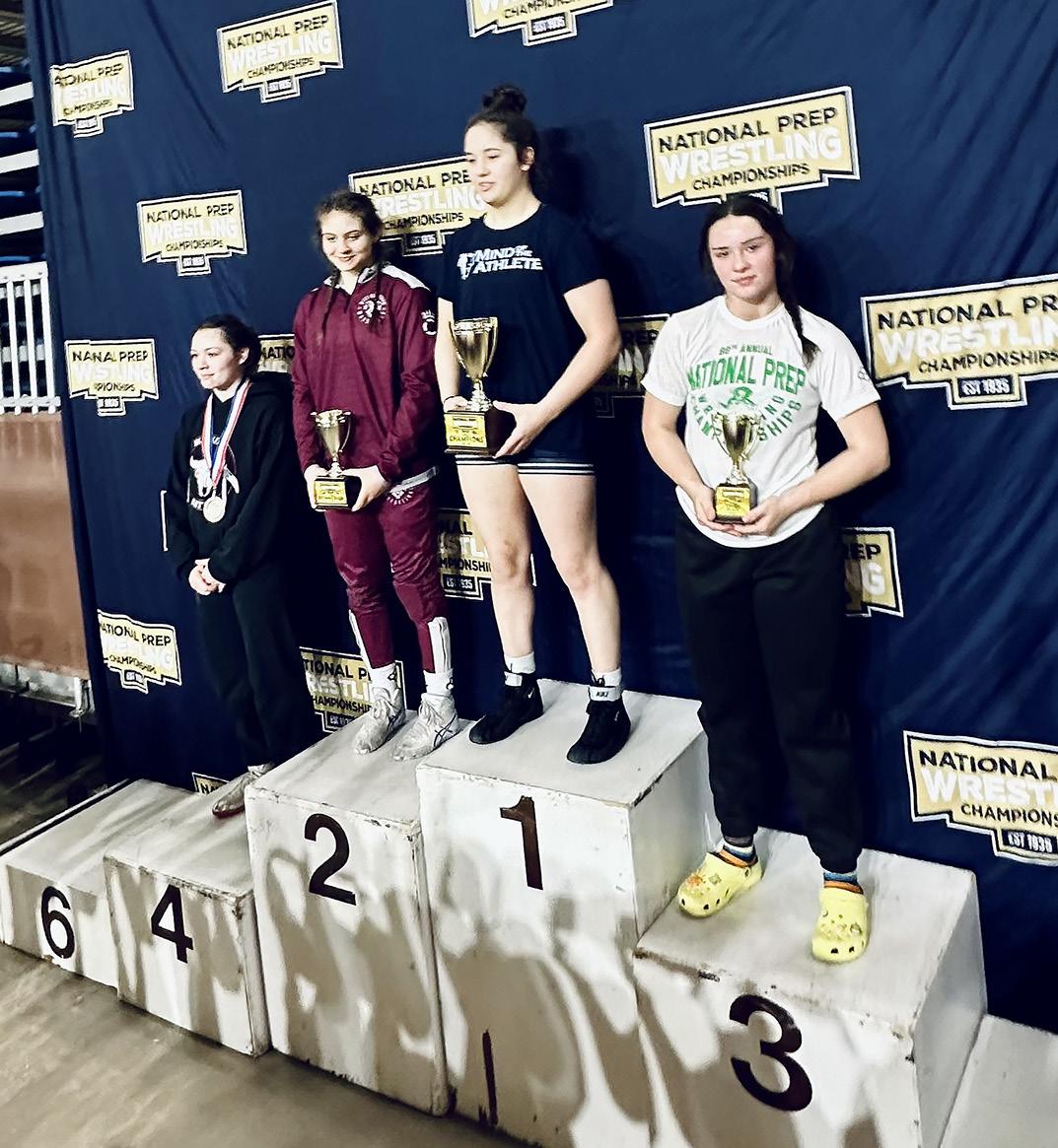 Top finishers Lady Irish junior Aliya Whaley (right) placed third and earned All-American honors at the National Prep Wrestling Championships at Lehigh University, becoming the first girl from Tennessee to qualify for the event.
