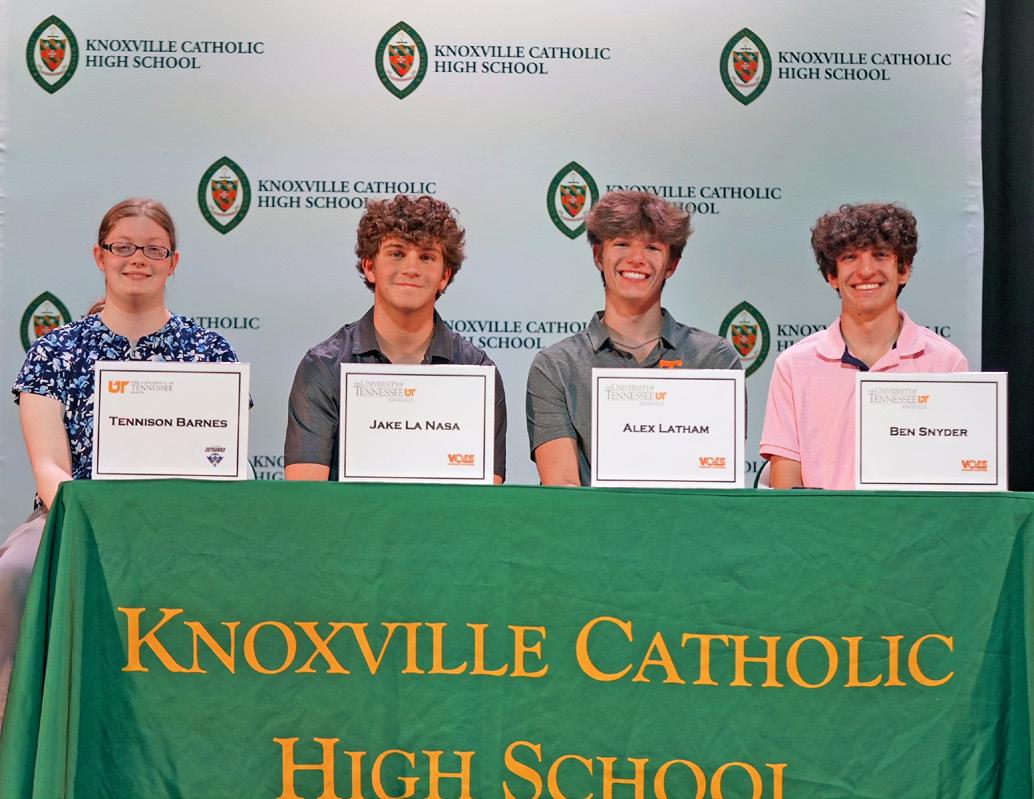 Knoxville Catholic signing day honors full-ride students Knoxville Catholic High School held its Academic Signing Day event May 13 to recognize those students who have been offered academic scholarships covering all tuition and fees at the college they plan to attend this fall. From left are Tennison Barnes, who is bound for the University of Tennessee at Martin, and Jake La Nasa, Alex Latham, and Ben Snyder, who will attend the University of Tennessee at Knoxville. Not pictured is Joseph Laco, UT-Knoxville.