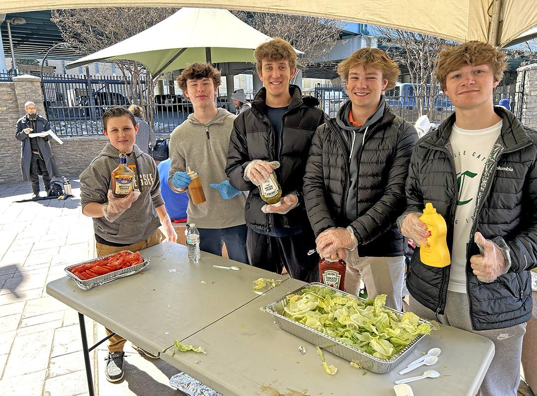 Feeding Christ Youth volunteers help with condiments in the food line in the KARM courtyard, where Bridge Ministry serves food to the homeless.
