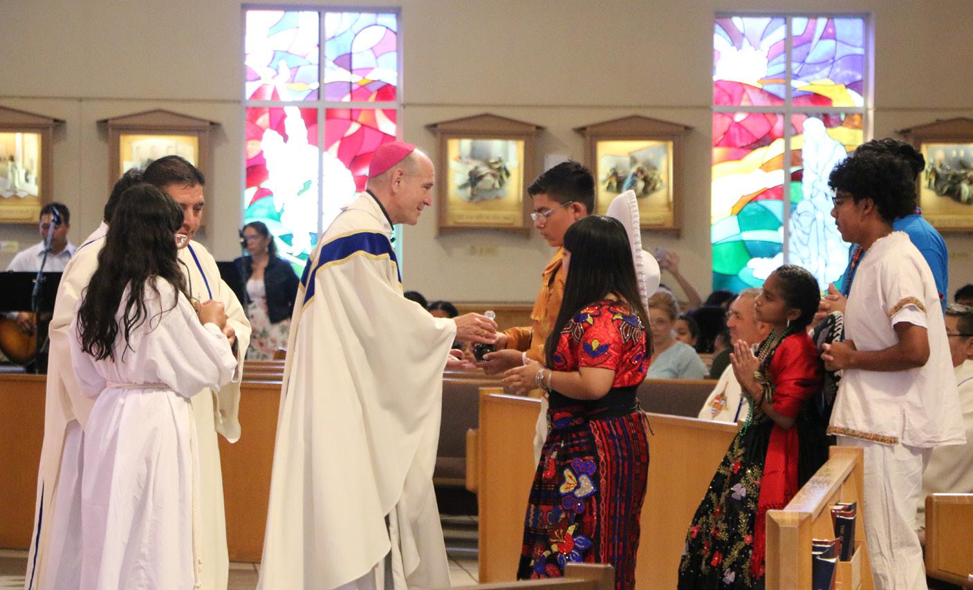 Diversidad de culturas Niños y jóvenes con trajes típicos de México, Guatemala y Honduras entregan las ofrendas de pan y vino al Obispo Mark Beckman durante la Misa. Atrá s se observa a Juan Gonzá lez, coordinador del coro de la parroquia Santo Tomá s Apostol, encargado de los cantos para ese dí a especial.