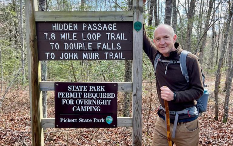 Caminata El Obispo Mark Beckman posa junto al letrero de información en el Pickett State Park en el condado Pickett.