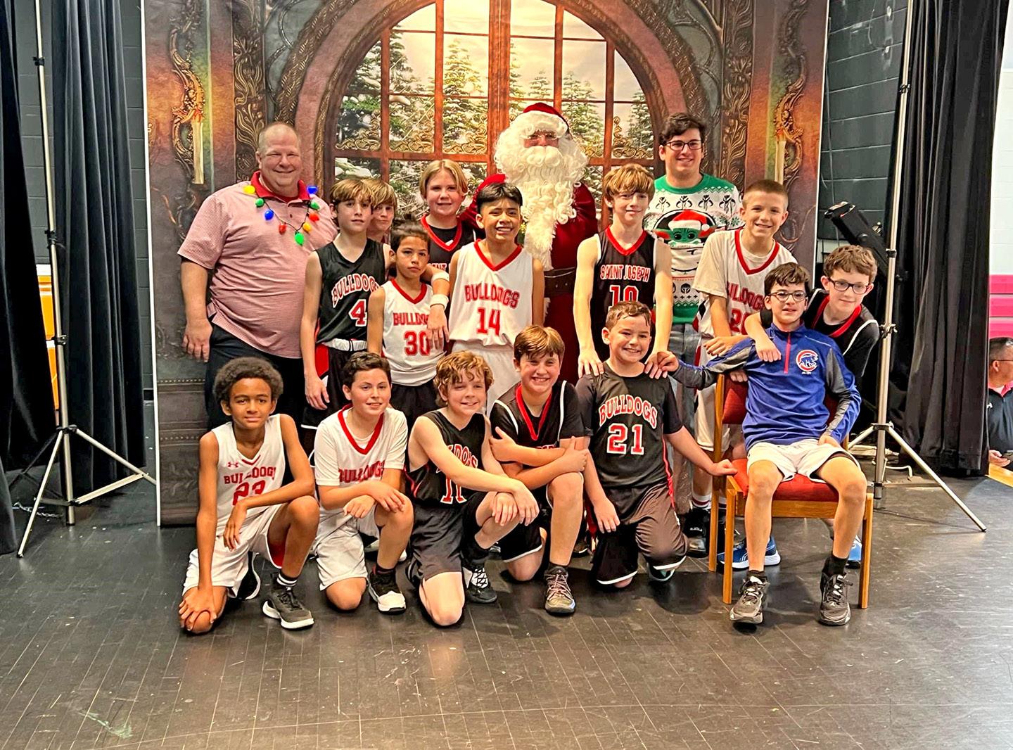 The JV team, composed of St. Joseph fifth-, sixth-, and seventhgrade students, organized the first Charity Christmas Inter-Squad Scrimmage on Dec 15. Led by head coach Sal Di Gennaro and assistant coach Owen Dougharty, the night featured the JV boys splitting into two teams to compete for school bragging rights, a 3-point shootout at halftime, a prize for the student who sold the most tickets to the event, and family photos with St. Nick.