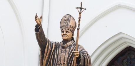 Estatua de bronce de San Juan Pablo II en Chennai, India. El Papa San Juan Pablo II habló a los jóvenes peruanos en su visita en 1985: " «En el sufrimiento se esconde una particular fuerza que acerca interiormente el hombre a Cristo» . Este es el consuelo de los que lloran. Los jóvenes, poniendo en juego su generosidad, no han de tener nunca miedo al sufrimiento visto a la luz de las bienaventuranzas. Han de estar siempre cerca de los que sufren y han de saber descubrir en las propias aflicciones y en las de los hermanos el valor salvífico del dolor, la fuerza evangelizadora de todo sufrimiento".