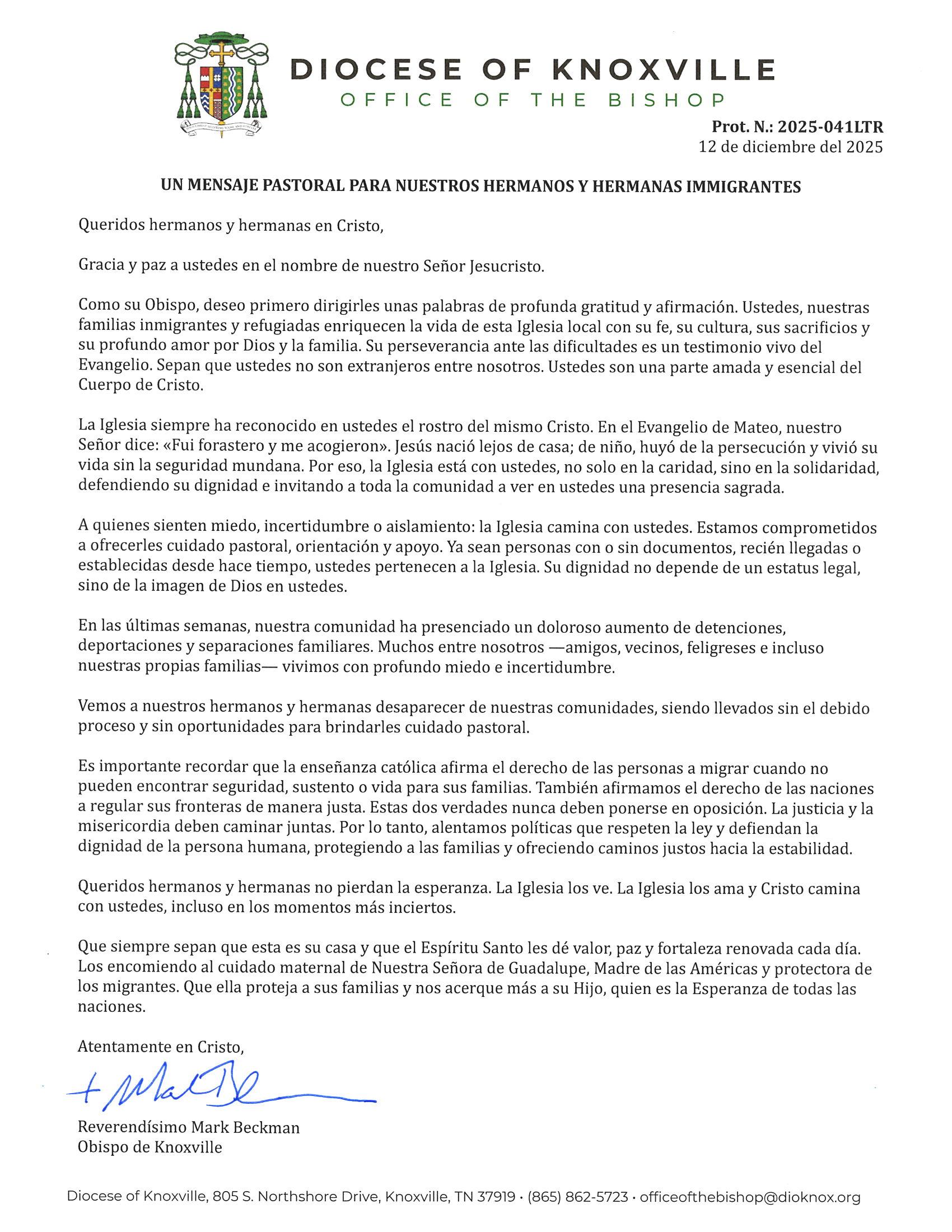Cualquier persona que tenga conocimiento real o que tenga una causa razonable para sospechar de un incidente de abuso sexual debe reportarlo a las autoridades civiles apropiadas, y al Centro McNabb, nuevo coordinador de asistencia para víctimas de acoso sexual de la diócesis de Knoxville, al número de teléfono para denuncias (865) 3219080. ■