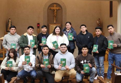 Salud Mental y Jóvenes Nuestra comunidad se reunió para recibir el libro Mente, Alma y Corazón durante un taller virtual simultáneo que conectó a diez diócesis del sureste de los Estados Unidos. En la fotografía, los líderes y jóvenes de la pastoral juvenil hispana muestran el material que utilizarán para promover el diálogo sobre la salud mental en sus parroquias.