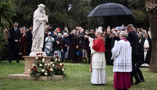 Jardines Vaticanos El Papa León XIV inaugura un mosaico de la Virgen María y una estatua de Santa Rosa de Lima, del siglo XVI, durante una ceremonia en los Jardines Vaticanos, el 31 de enero de 2026. (OSV News/Vincenzo Livieri, Reuters). Santa Rosa de Lima fue la primera santa de América y miembro de la Tercera Orden de Santo Domingo, conocida por su entrega a los ancianos, enfermos y niños sin hogar. Esta estatua de mármol peruano la muestra sosteniendo al Niño Jesús en un "desposorio místico", donde Él le ofrece un anillo y rosas. A sus pies destaca un ancla, símbolo de esperanza y recuerdo de su defensa histórica contra piratas. El Papa León XIV, quien trabajó años en Perú como misionero, bendijo la imagen resaltando que Rosa es un ejemplo del llamado universal a la santidad y una luz ante las heridas del hambre y la violencia en el mundo actual.