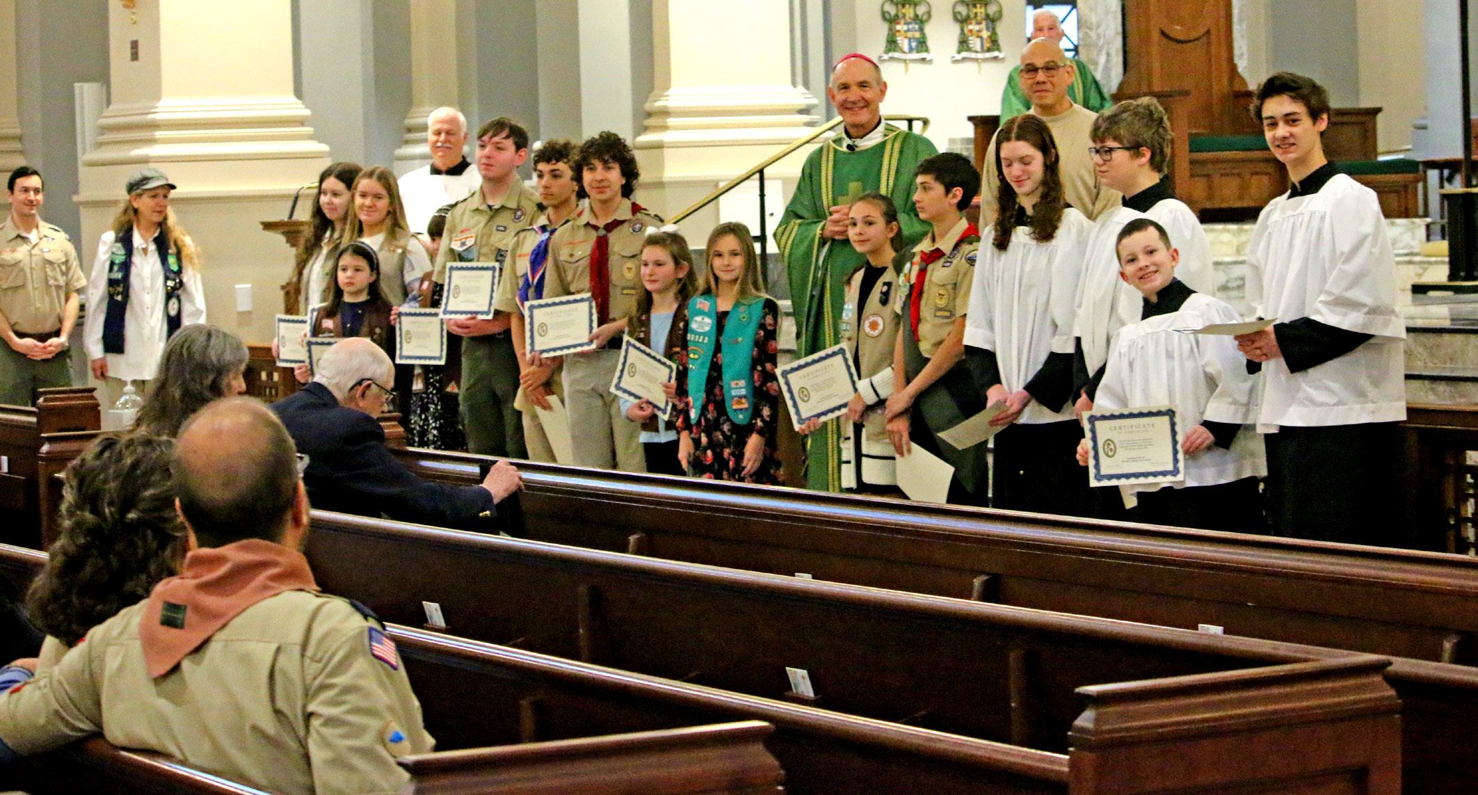 A score of Scouts Bishop Beckman presented certificates to 20 youth Scouts at the end of Mass on Feb. 1.
