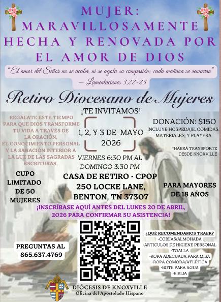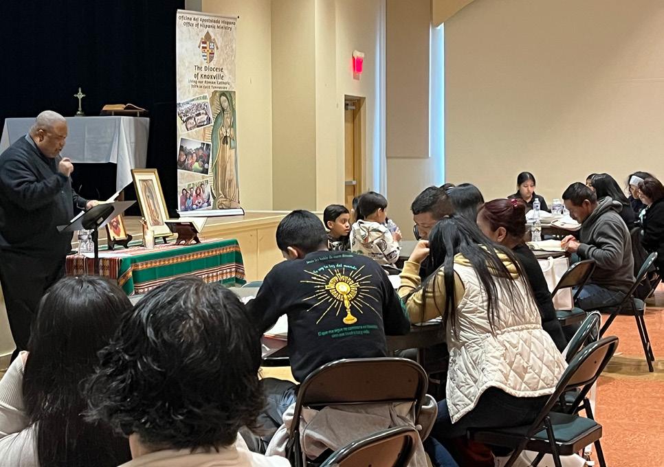 Catequistas (derecha) A finales de febrero tuvimos la gran alegría de tener al Padre Fernando Torres, de la Diócesis de Ponce, Puerto Rico, como presentador en nuestro Retiro Diocesano de Catequistas, que tuvo lugar en la parroquia Santo Tomás Apóstol, en Lenoir City. Tuvimos una asistencia récord de 104 personas. El Padre Fernando, especialista en el Antiguo Testamento, empezó el retiro haciéndonos reflexionar en la pregunta fundamental: ¿de dónde vienes y a dónde vas? Como catequistas, ver nuestra historia, quiénes somos y el llamado que Dios nos hace y su promesa, fortalece nuestro caminar para cumplir la misión recibida.