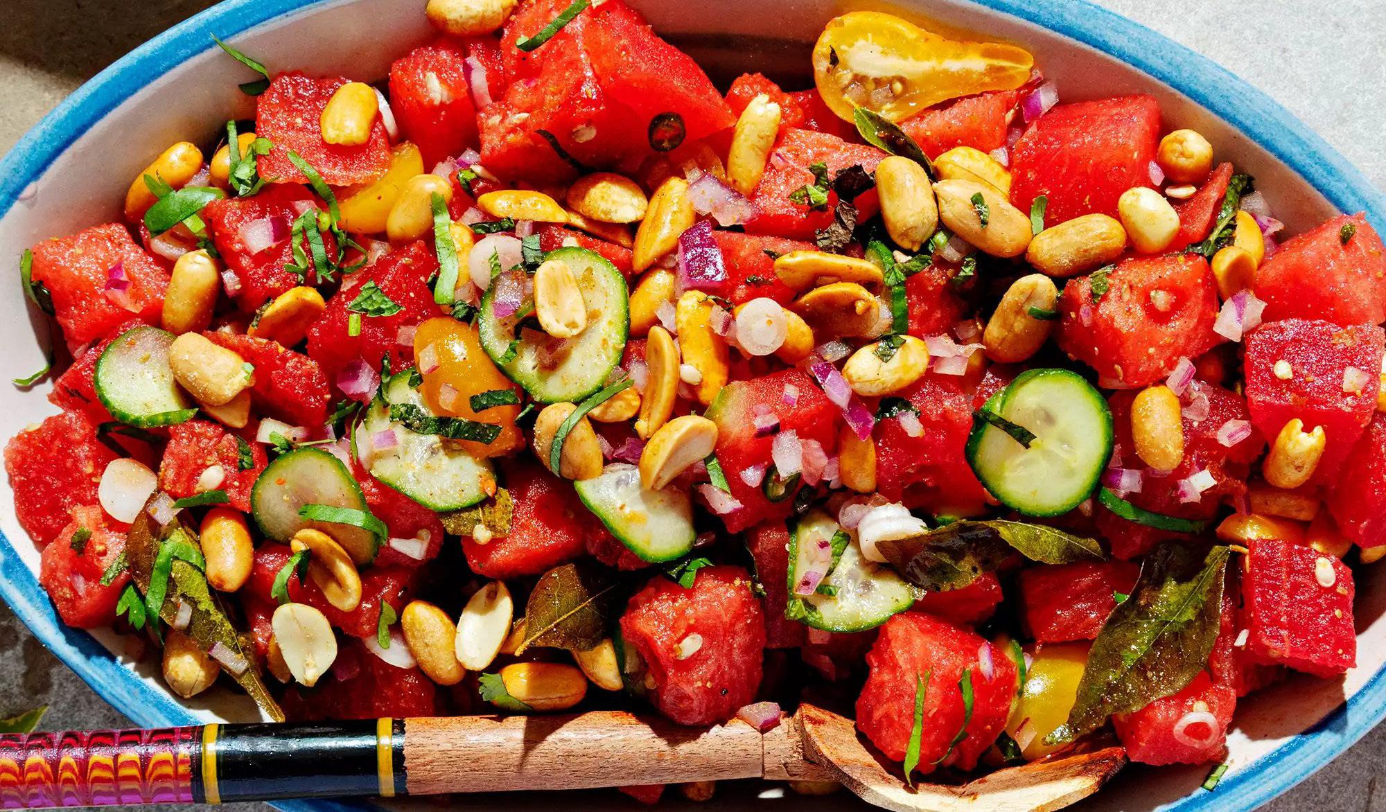 2. Combine watermelon, cucumber, onion, radishes, serrano, salt and cayenne in a large bowl, and toss well. Add peanut mixture, lime juice, mint, basil, cilantro, cane syrup and the remaining teaspoon of chaat masala. Remove and discard curry sprig. Toss gently and serve. hot bacon press or castiron skillet. Allow the sandwiches to cook for 5 to 7 minutes.