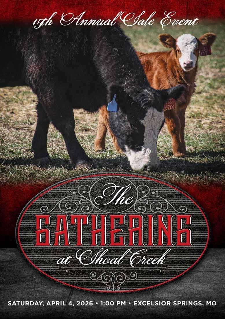 As we continue to review the livestock market results, we all rejoice for the cow/calf producer being rewarded for their calf crop. It is no secret that running a cow herd is not for the faint of heart with challenges of weather and herd health so let us all enjoy this cycle of the beef business. The Shoal Creek team has a passion for that they do day in and day out. This passion is reflected by the 2026 The Gathering offering. The fancy open females are stacked with genetic power along with a stellar look, ready for the tan bark and creating memories for their new young owners. It is not often a program offers donors that have done so much for their breeding lineup, but the breeders are doing just that. There are females for both the spring and fall calving programs so study your lesson for new exciting ladies. The bull division once again carries the same tried and true performance power that Shoal Creek is known for. Long time customer Perry Vandiver recently topped the market with calves sired by Shoal Creek bulls which validates the value of this program. Now is the time to freshen up your breeding program with new breed leading genetics.
