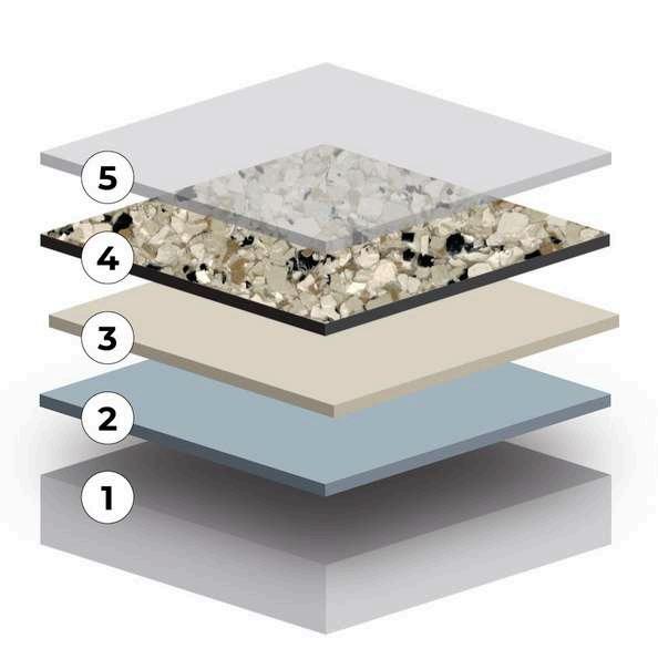 Les résines pailletées sont des revêtements de sol intérieurs et extérieurs à base de flocons de vinyle et de résine polyaspartique. Un revêtement multicouche, ultra résistant.
