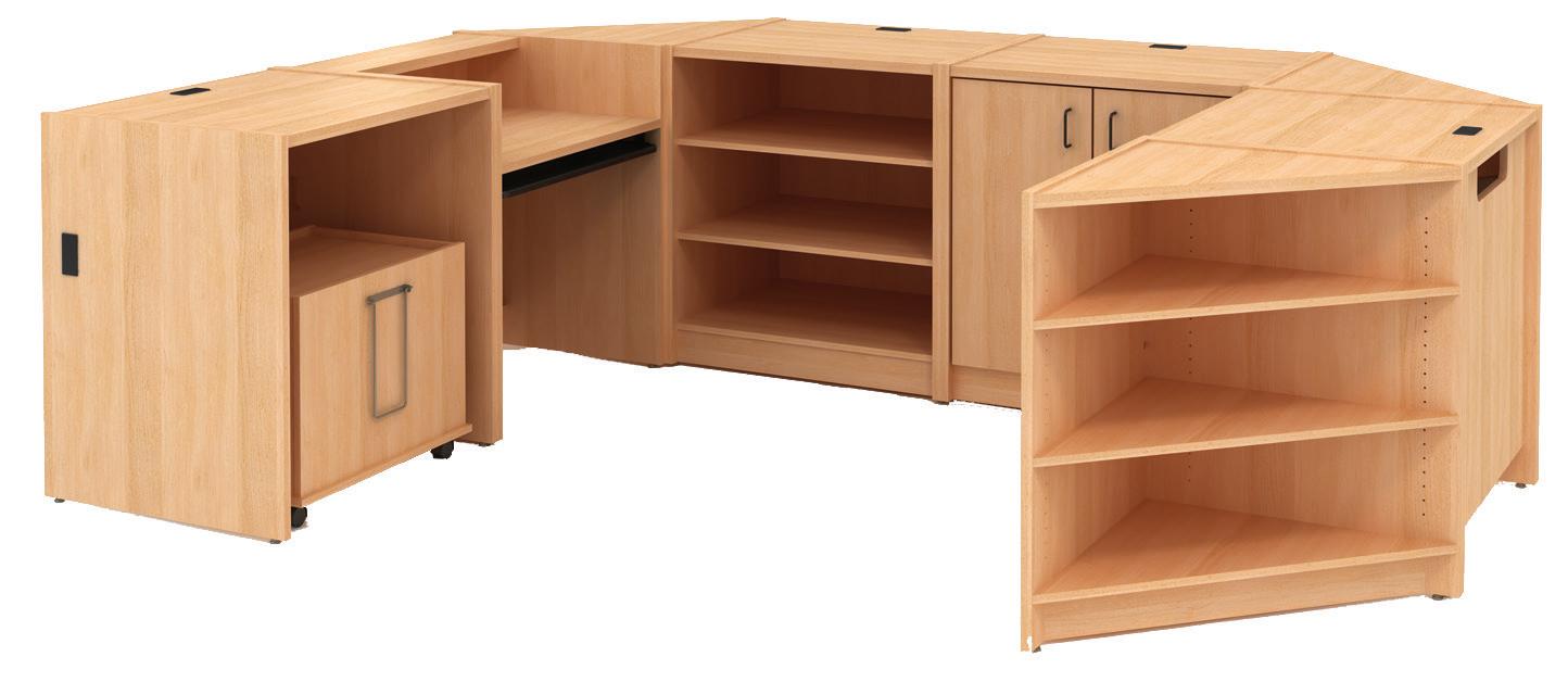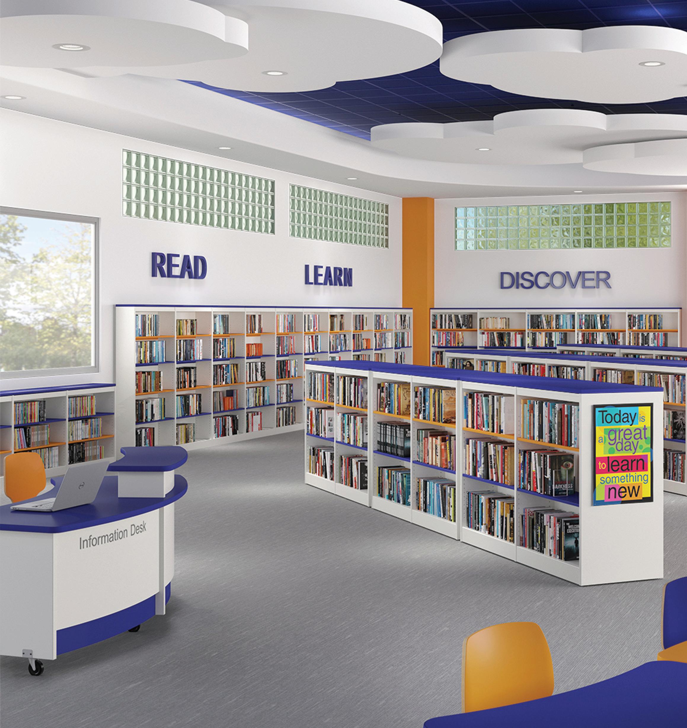 • Contains one each: BM 143 000* (90º Open Corner), BM 015 000* (Book Return), BM 915 000* (Book Cart), and two BM E42 000* (Computer Desk with Patron Ledge) units