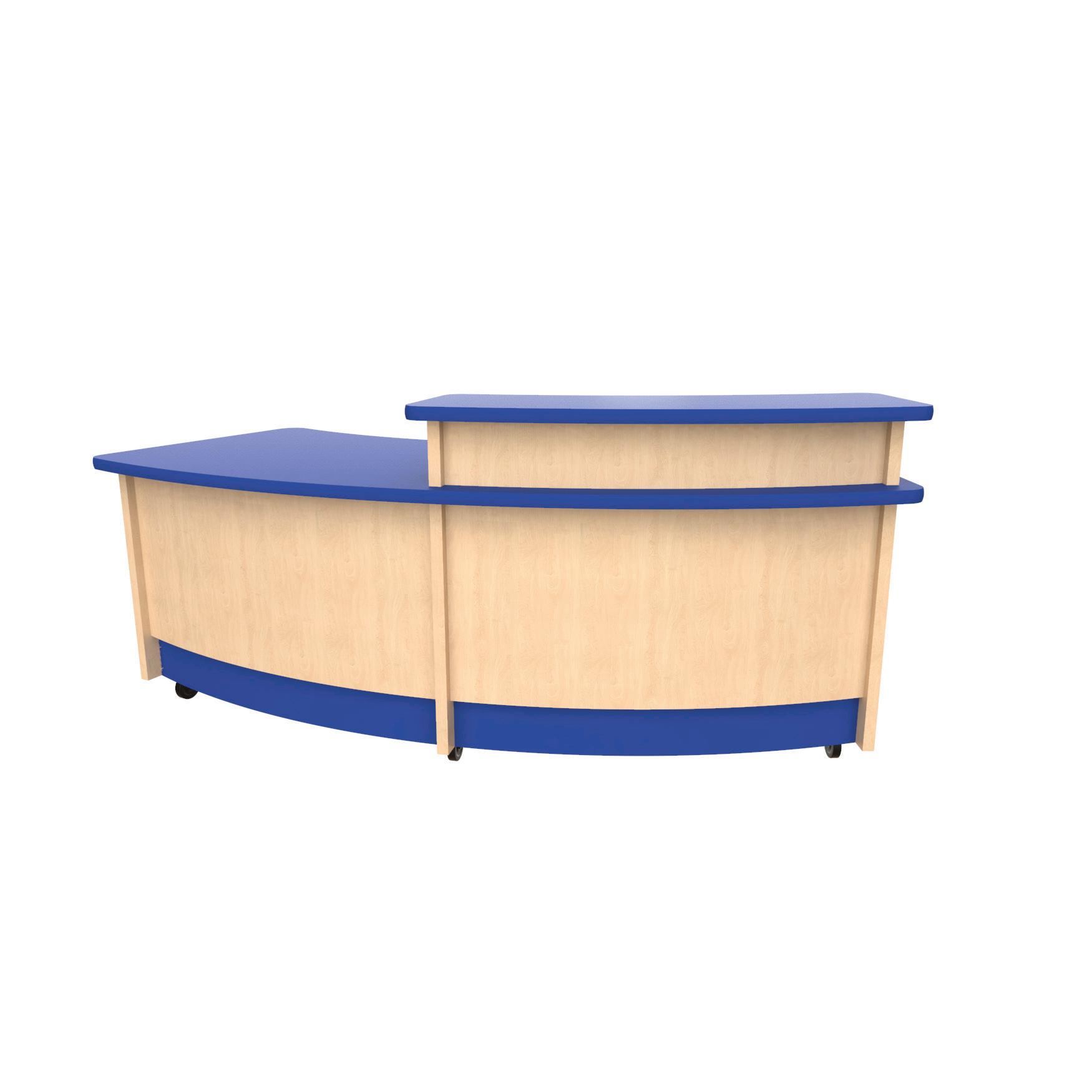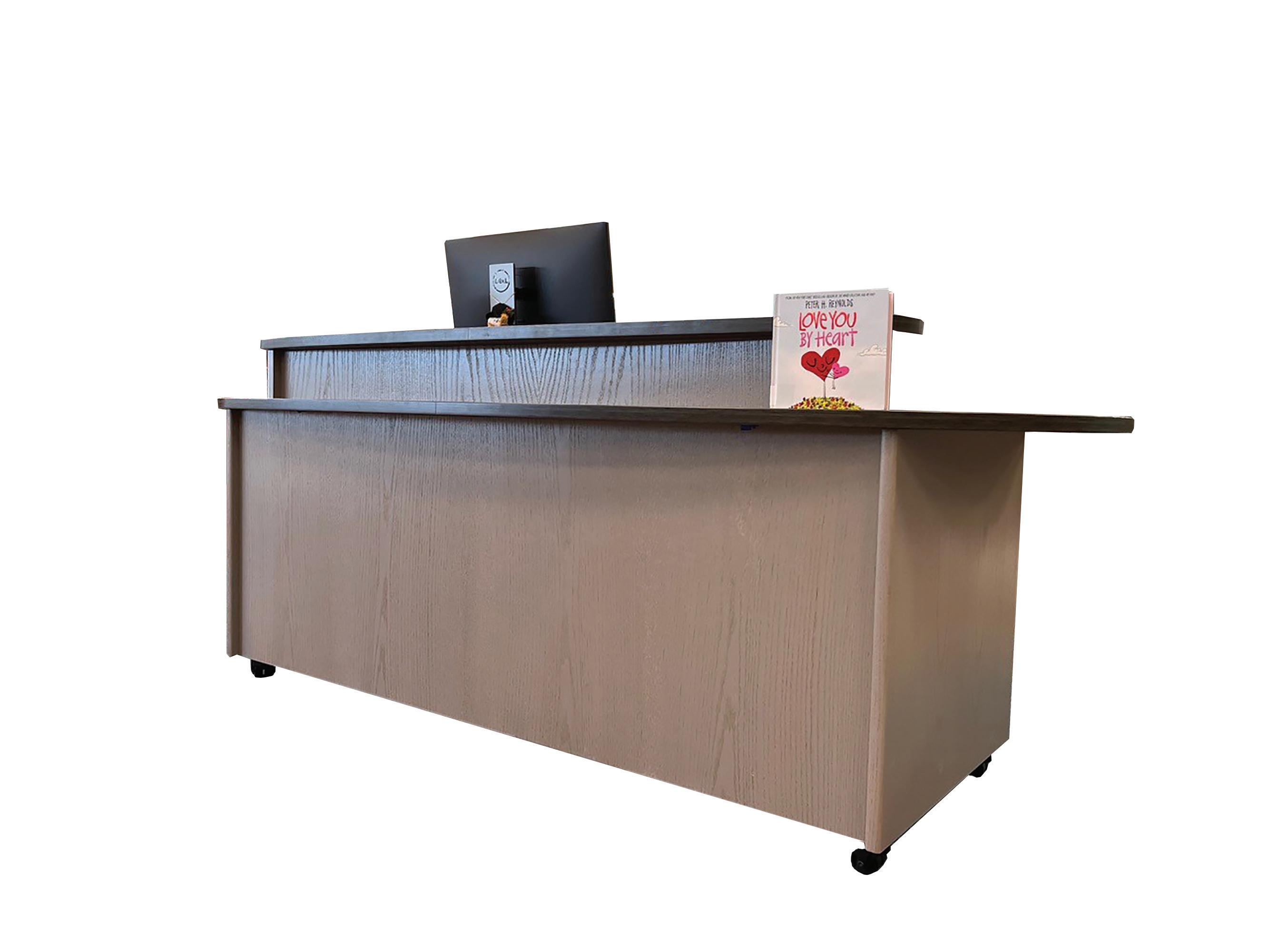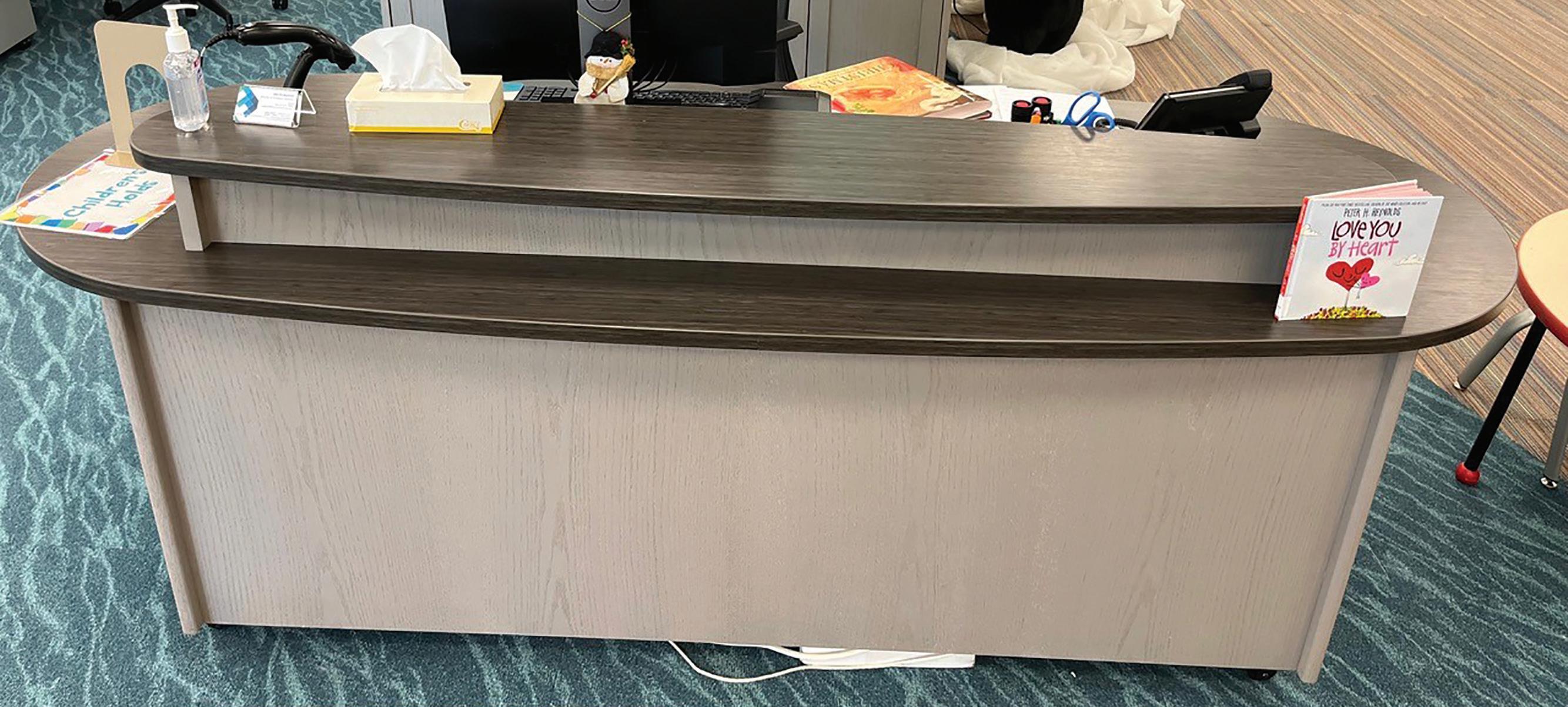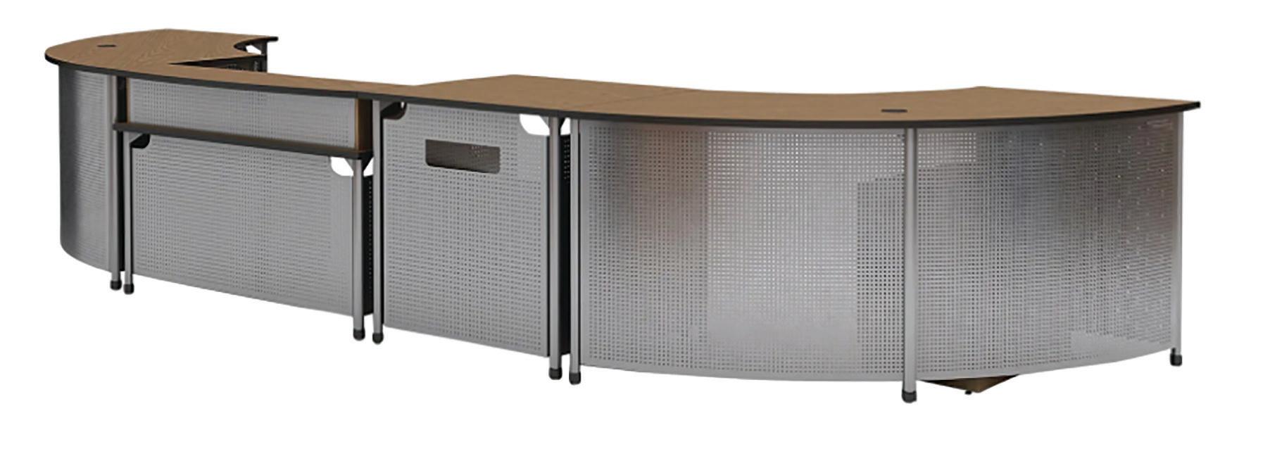 • Desk features oval-shaped laminate work surface and patron ledge