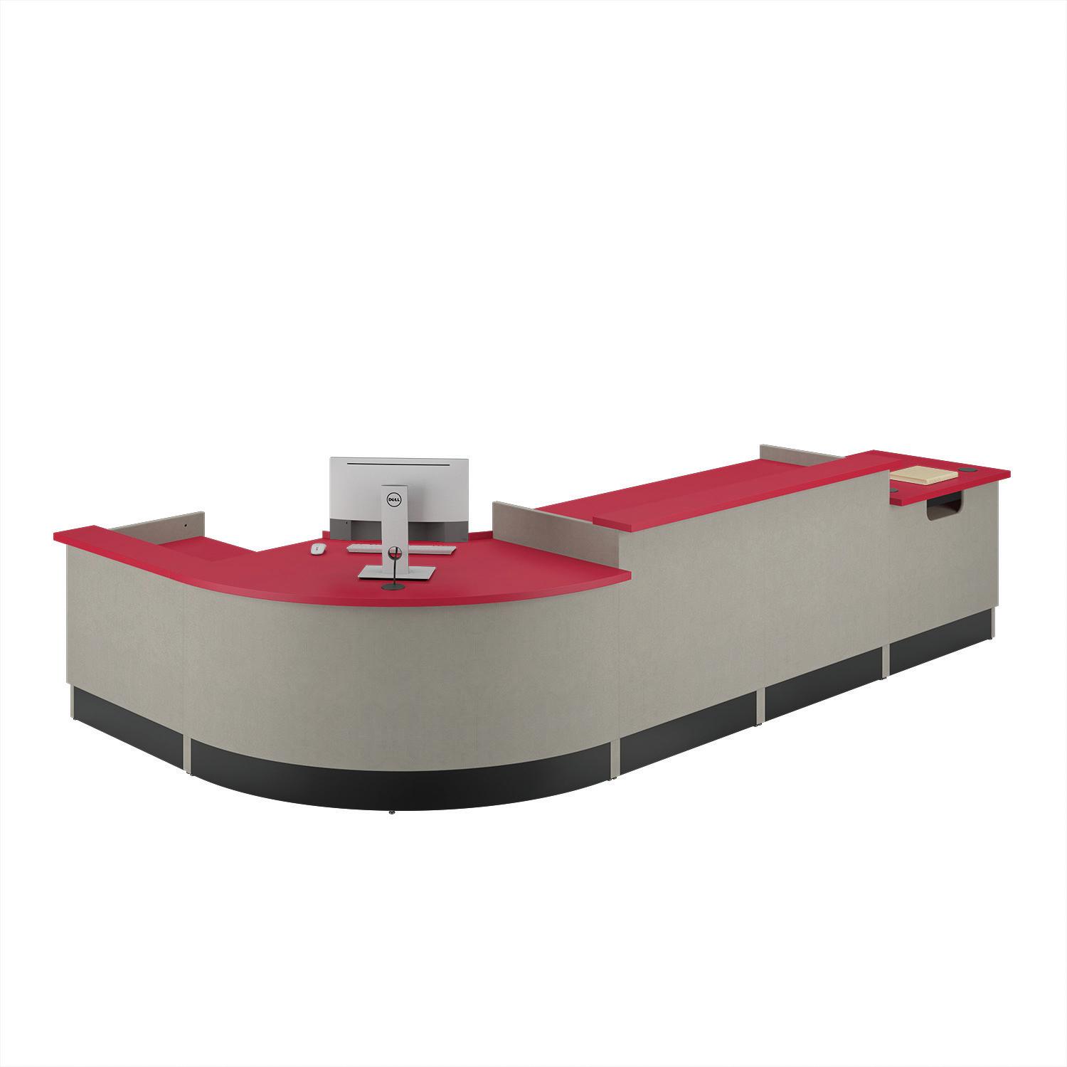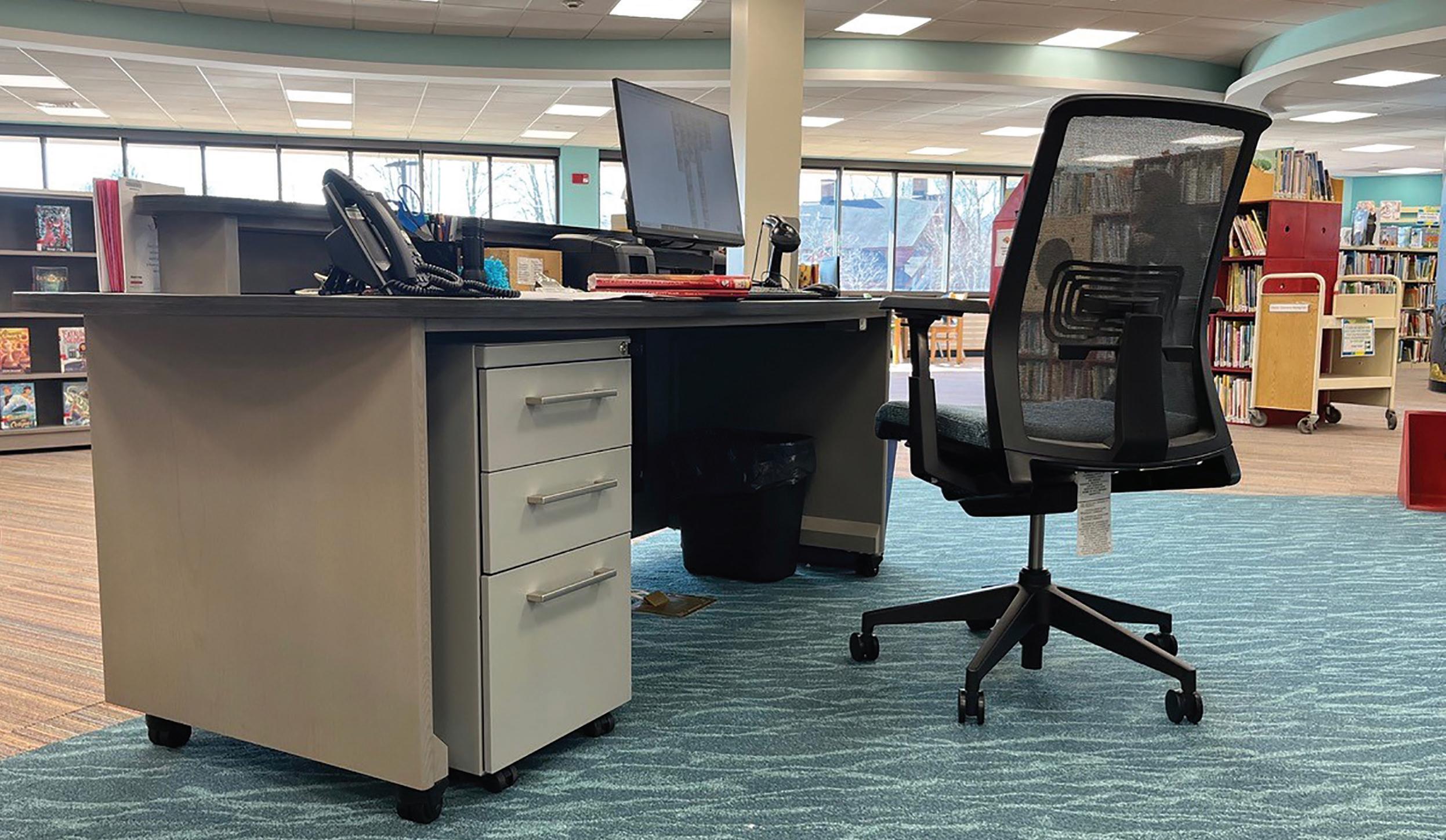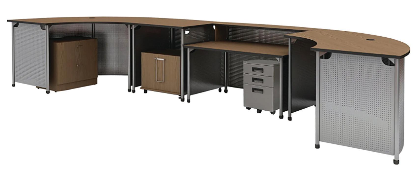 • Desk features oval-shaped laminate work surface and patron ledge