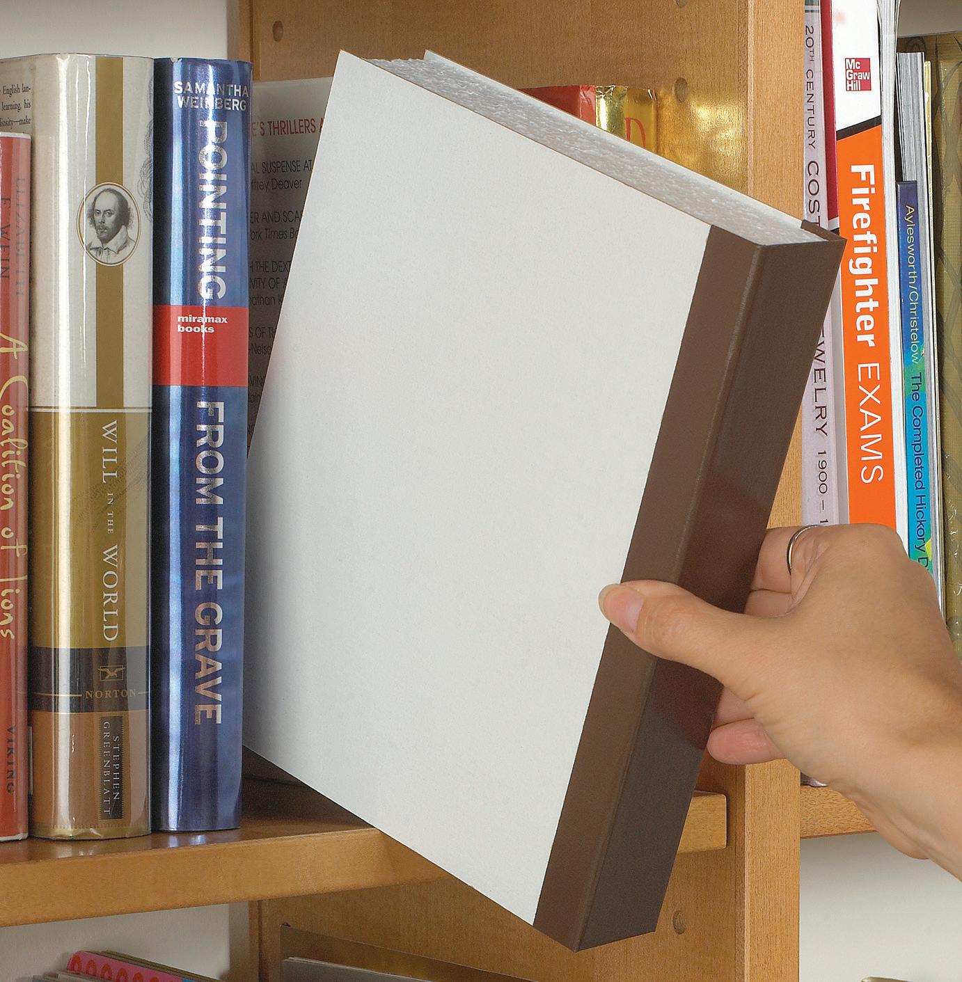 Built-in bookstops keep books from falling off the back