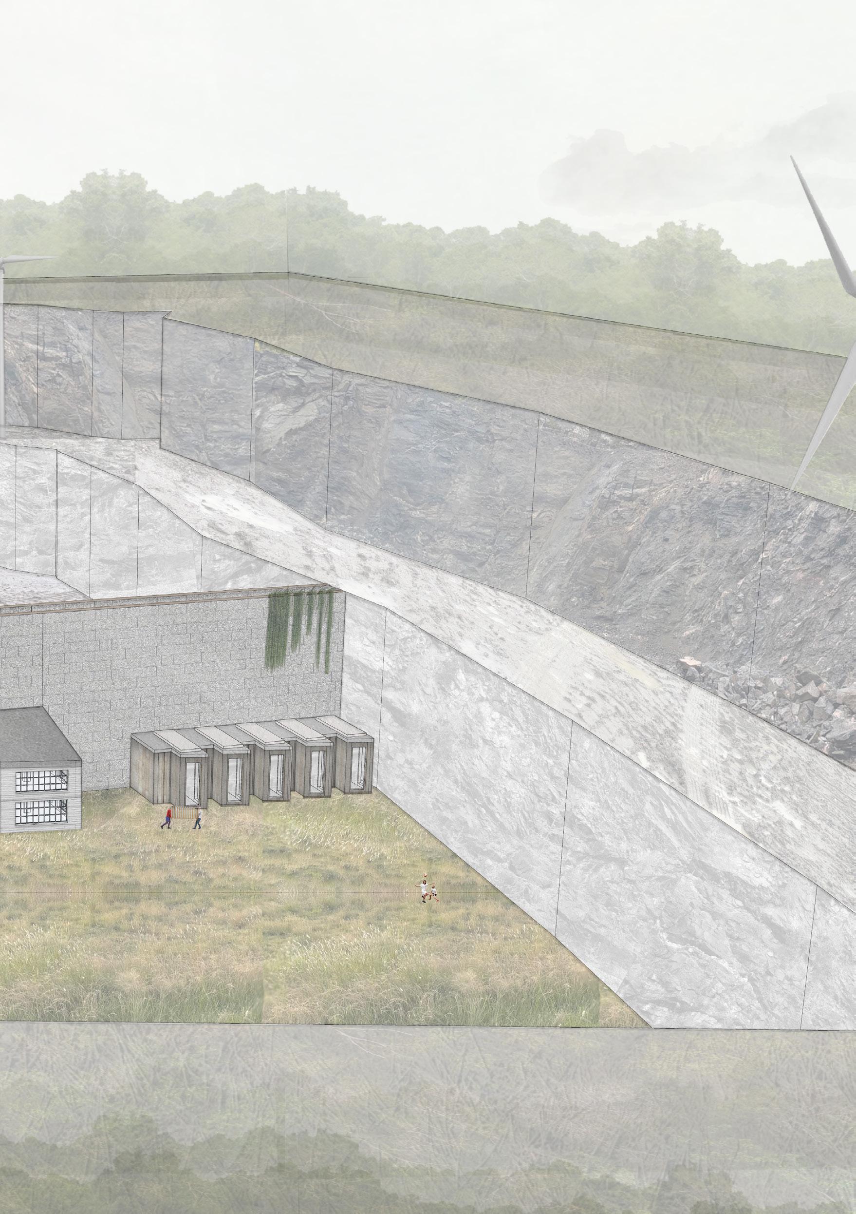 Now lying abandoned, Rubislaw Quarry was active for over 200 years and produced an estimated six million tonnes of granite. Juxtaposing the lack of support afforded to the quarrymen following the sites closure in 1971, the creation of a carbon capture testing and training facility at Rubislaw aims to draw attention to the history of industry within the city whilst utilising and diversifying the skill-set of workers who will inevitably become redundant as oil production ceases.