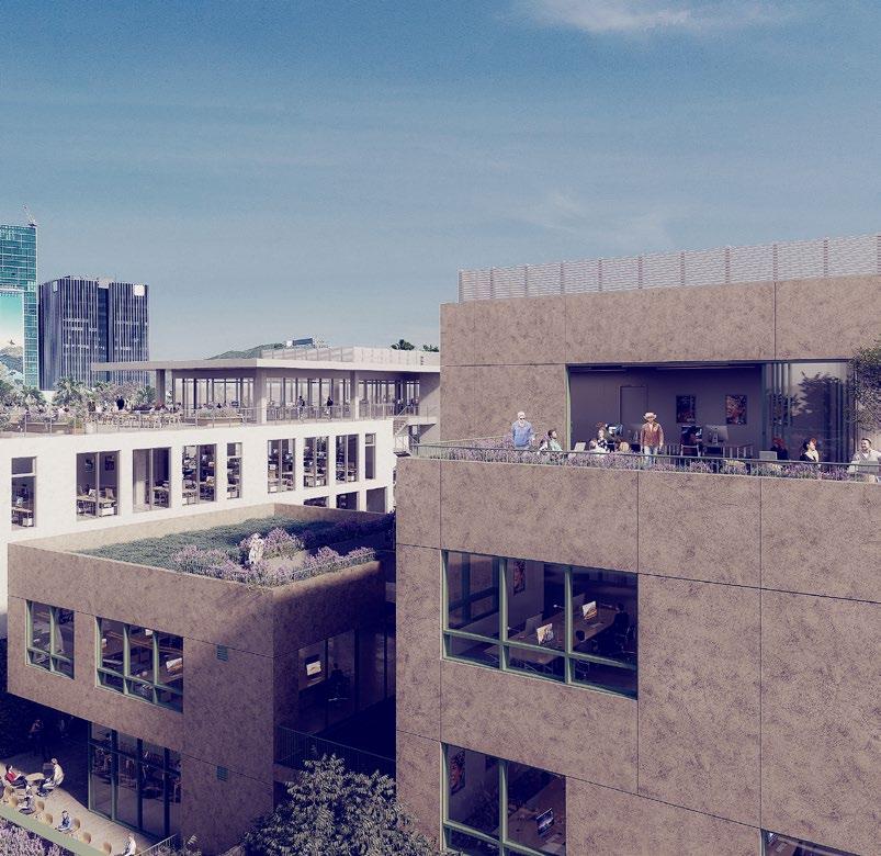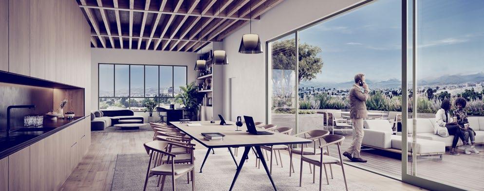 Thoughtfully composed terraces and green roofs blur the line between inside and out, while panoramic views and soft interiors create a serene, light-filled atmosphere for focused work. Floor-to-ceiling glass and curated landscaping welcome tenants into a setting that feels more like a private retreat than a traditional office.