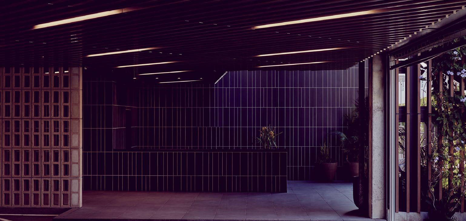 The ground floor �elcomes tenants and guests �ith a refined palette of dark tile, exposed concrete, and filtered light— setting a calm, design-dri�en tone from the moment of arri�al.