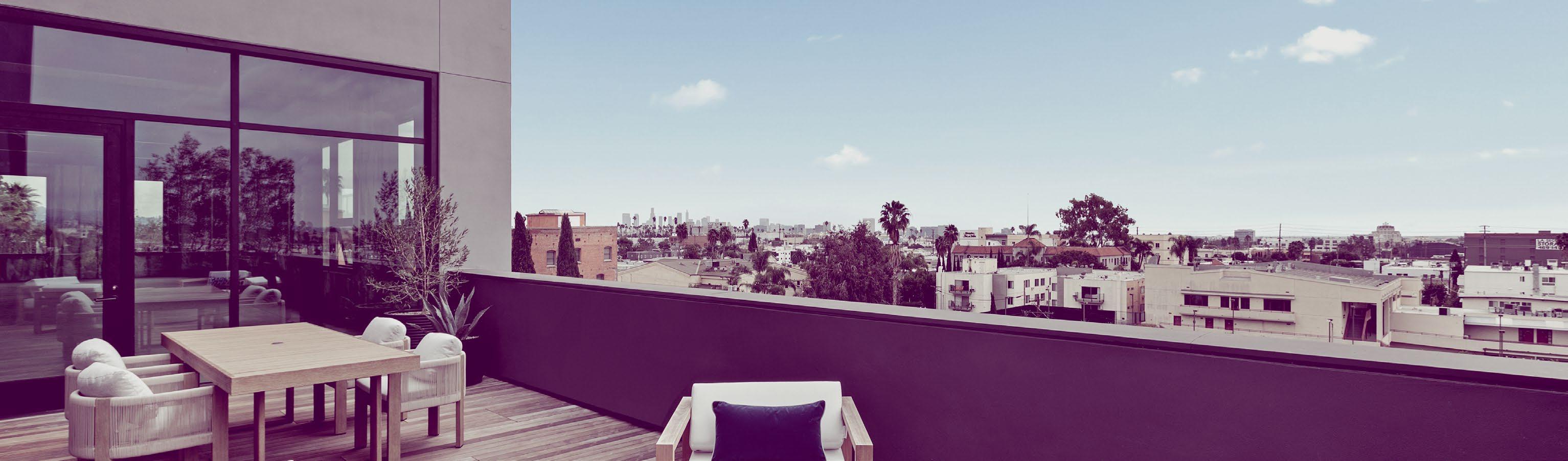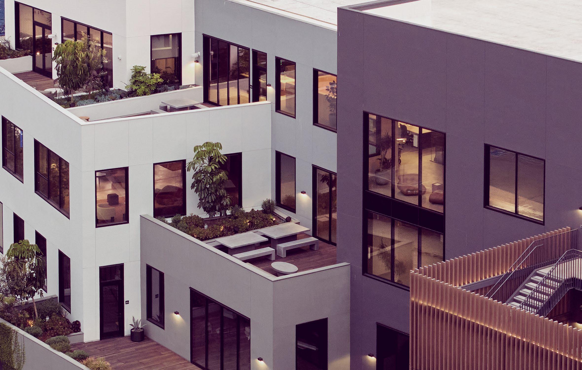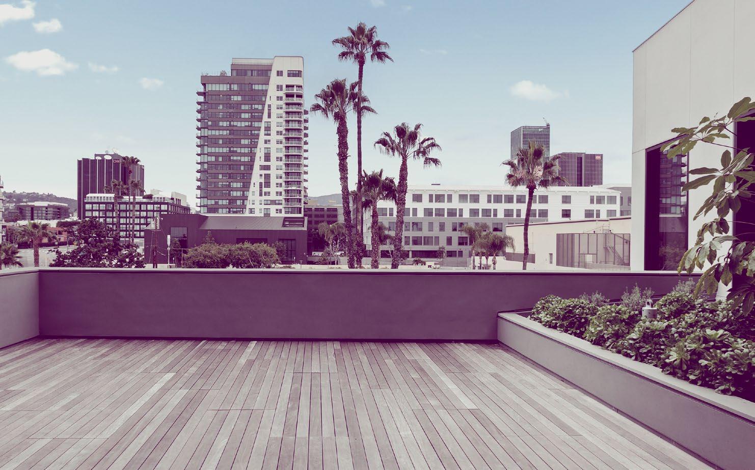Expansi�e pri�ate terraces �ith layered greenery and panoramic sightlines extend the �orkplace outdoors—ideal for open-air meetings or quiet reset moments abo�e Holly�ood.