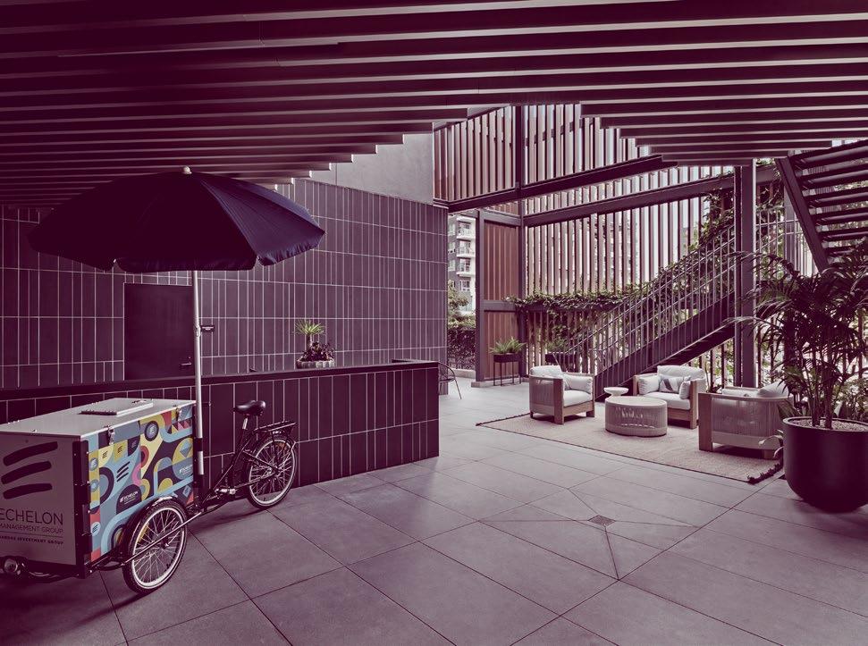 A co�ered outdoor lounge adjacent to the Go Get Em Tiger café blurs the line bet�een �ork and social space—an in�iting spot for morning coffee, informal meetings, or mid-day recharge.