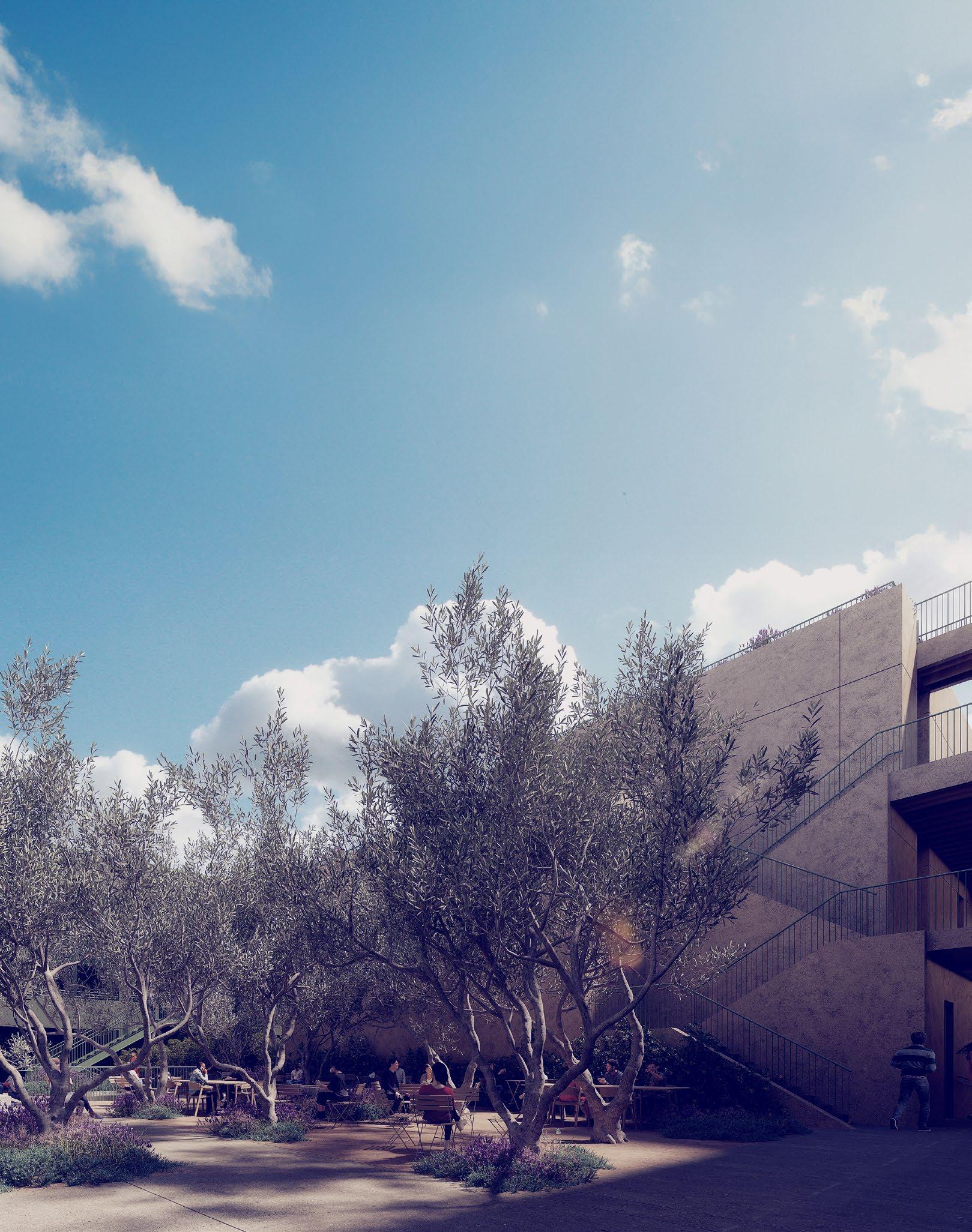 Framing a central olive grove and inspired by the serenity of Mediterranean courtyards, the environment is designed to quiet the noise of the city and invite creative flow.