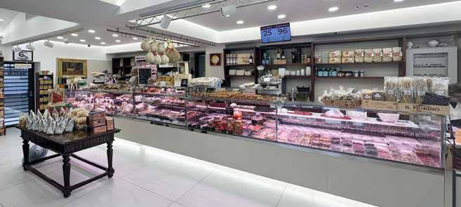 L’ambiente, articolato in aree separate per il banco carni, la salumeria e i prodotti confezionati è luminoso, elegante e molto funzionale perché ogni zona, dotata di retrobanchi capienti, è delimitata ma consente una visione complessiva dell’offerta.