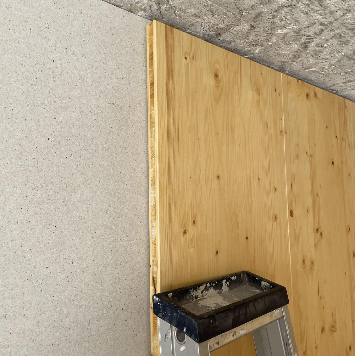 Deze leempleister werd aanvankelijk ook voorzien als afwerkingslaag voor de wanden, hierop werd tijdens de werf teruggekomen: angst voor onderhoud en gebruiksgemak was doorslaggevend om over te gaan naar een klassieke gipspleisterlaag.