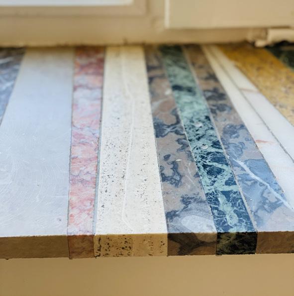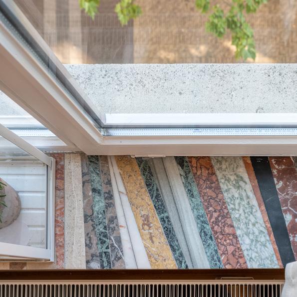 Waar mogelijk wordt het bestaande venstertablet behouden (of gedemonteerd en teruggeplaatst). Indien niet mogelijk, werd er geopteerd om de venstertabletten in een zelfde stijl uit te werken als de vloer in de inkomhal: een strategie die we hanteren is het toevoegen van een ‘chiquer’ recuperatiemateriaal. Deze materialen geven een extra touch aan de studio’s, een ‘luxuriousfeeling’.
