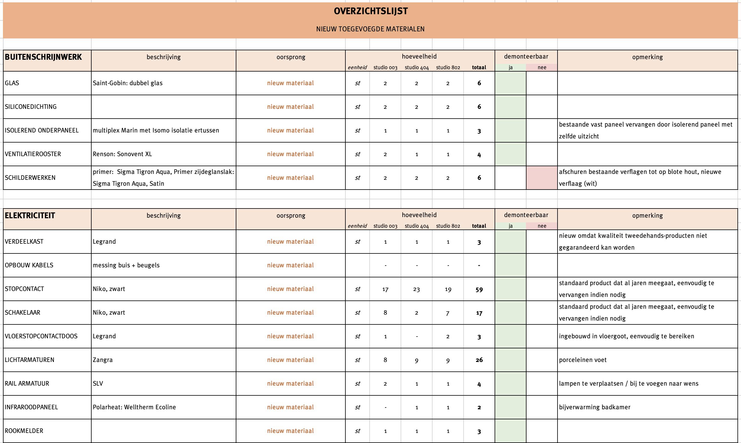 - Door middel van verschillende lijsten die vooraf en achteraf werden opgesteld, kon er een gedetailleerd overzicht verkregen worden van de toegepaste materialen.