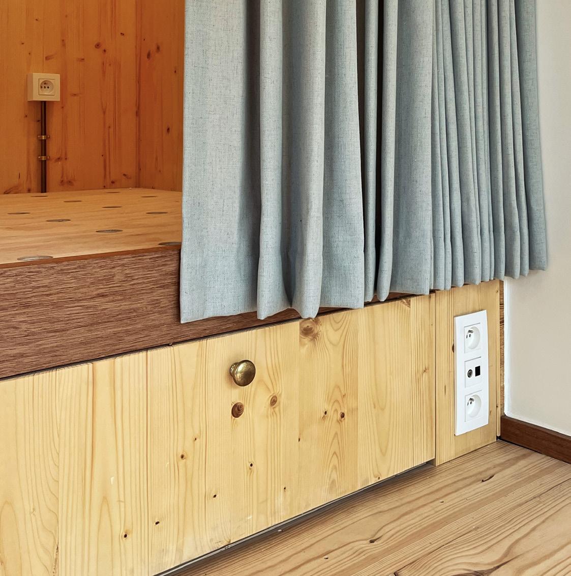 Het bedmeubel is verhoogd, zodat de ruimte hieronder