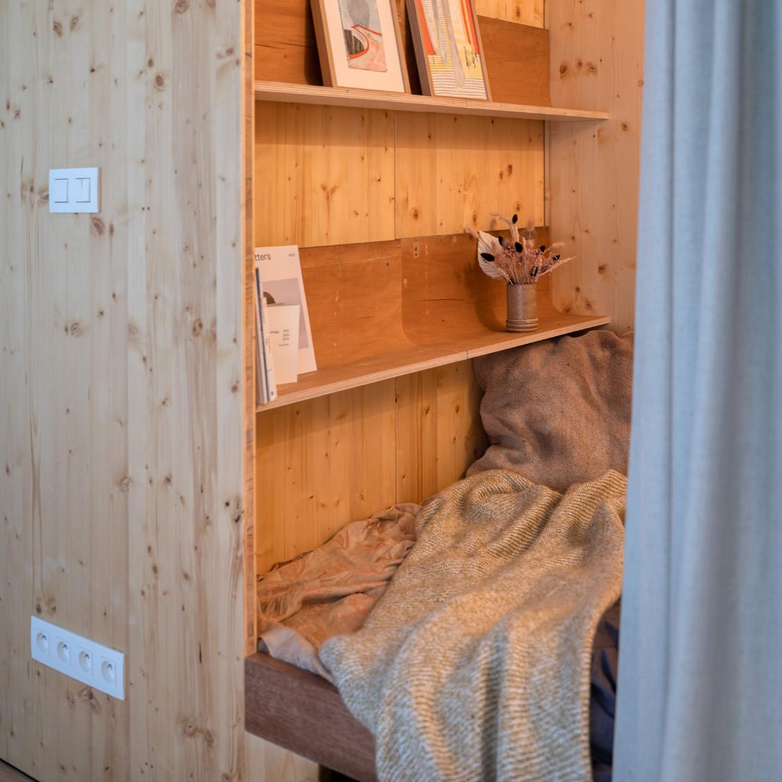 Een soort bedstee, een ruimte die als slaapkamer kan dienen (wanneer het gordijn gesloten is), maar evengoed een uitbreiding op de leefruimte kan zijn, een fijne zitplek.