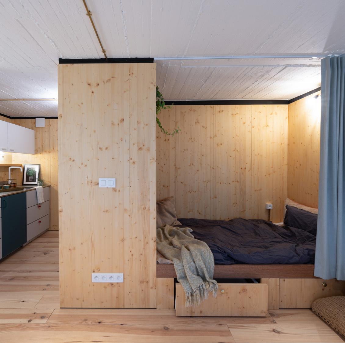 Het bed wordt mee voorzien als onderdeel van het vaste meubilair. Vermits de oppervlakte van de studio’s zeer beperkt is, zien we dit als een eenvoudige manier om de leefruimte te vergroten en extra bergruimte te voorzien. Het bedmeubel staat zelfstandig tussen de wanden in en kan worden weggenomen.