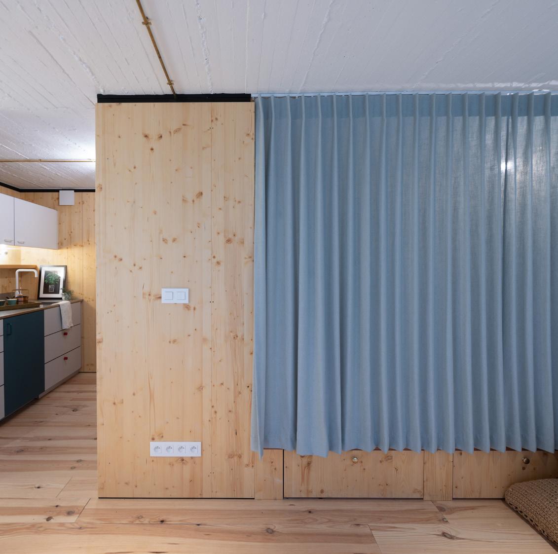 Er worden gordijnen voorzien voor alle ramen en er wordt ook telkens een gordijn voorzien aan de bedstee. Op die manier kan de bewoner kiezen wanneer het bed onderdeel kan uitmaken van de leefruimte en wanneer niet.