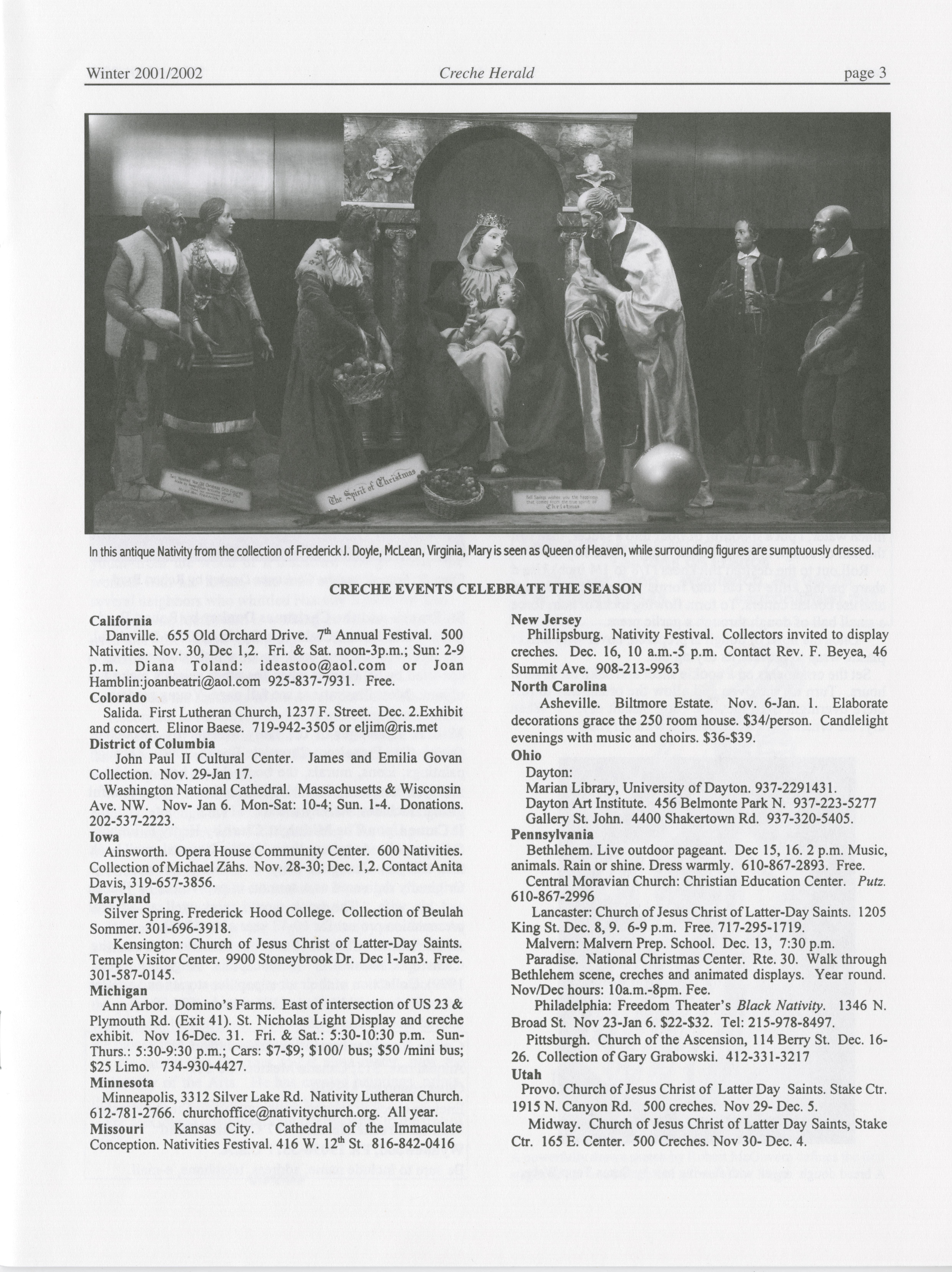 Secondly, in between conventions, we are considering some activities or projects which we think you will find appealing. We shall be presenting a creche photo project at Lancaster to see if it interests members in participating. We also are considering initiating a research project on the history of the creche tradition in the United States. At Lancaster, we will have had exchanges with the attendees concerning other interests that they might have. Those of you who could not attend the convention are most welcome to send me your suggestions for future activities. We also are looking for volunteers who can help us craft and establish a website.