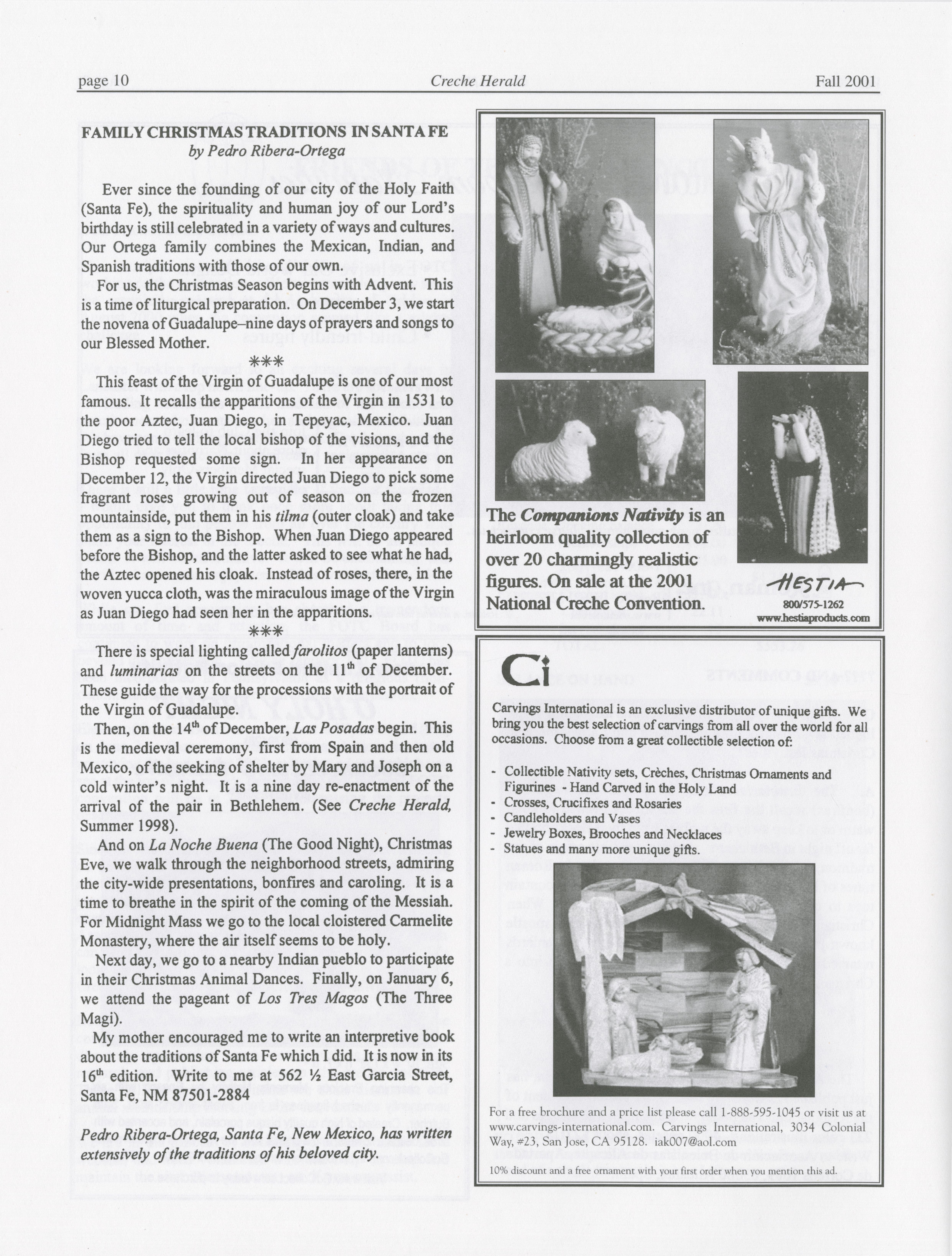 In this Fall 2001 issue, Creche Herald again offers articles by and about presenters atthe Friends of the Creche Convention November 8-10, 2001. In addition, below you will find sketches of those not already mentioned.