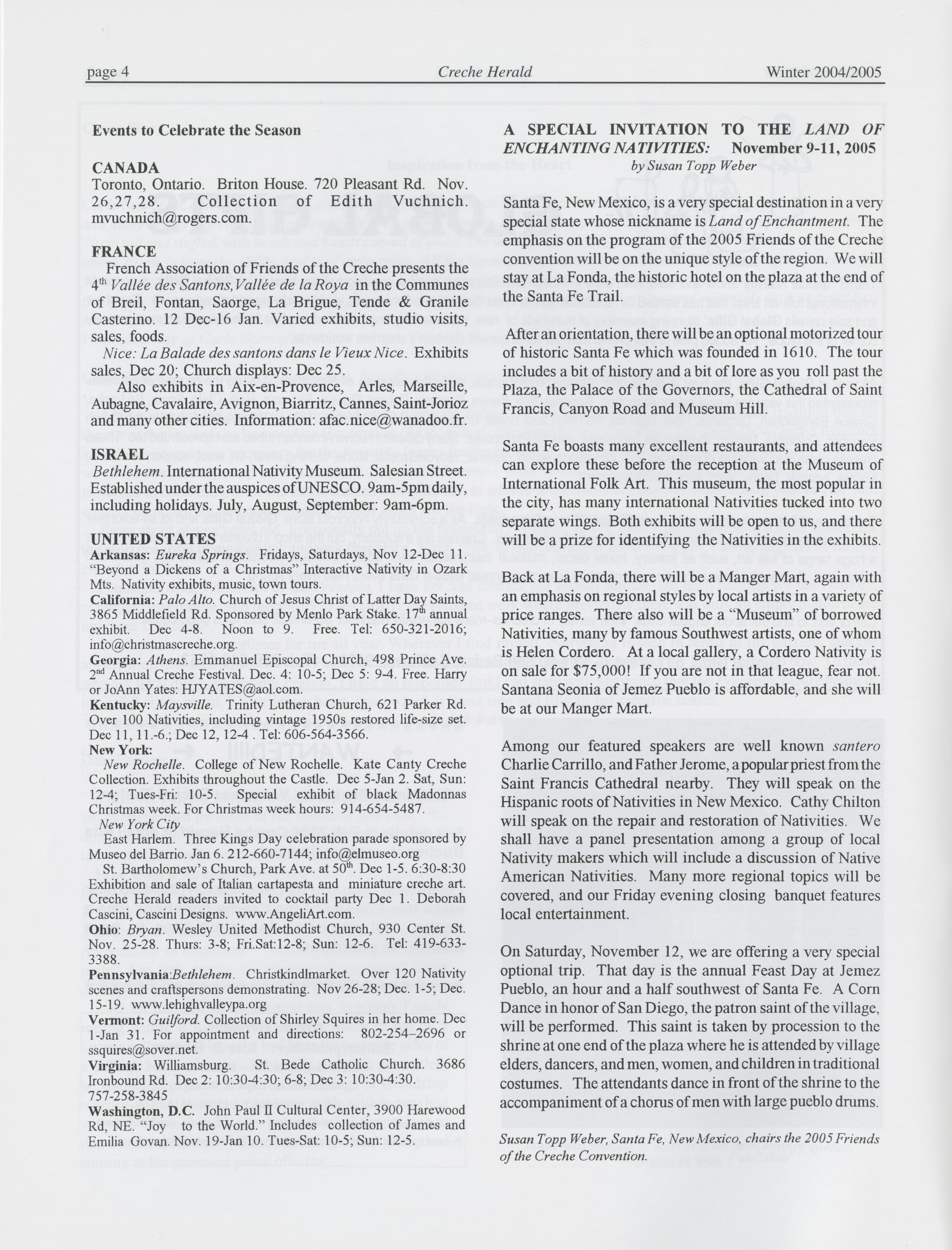 See details in Fall 2004 Creche Herald or email Rita Bacher at crecher@op.net.