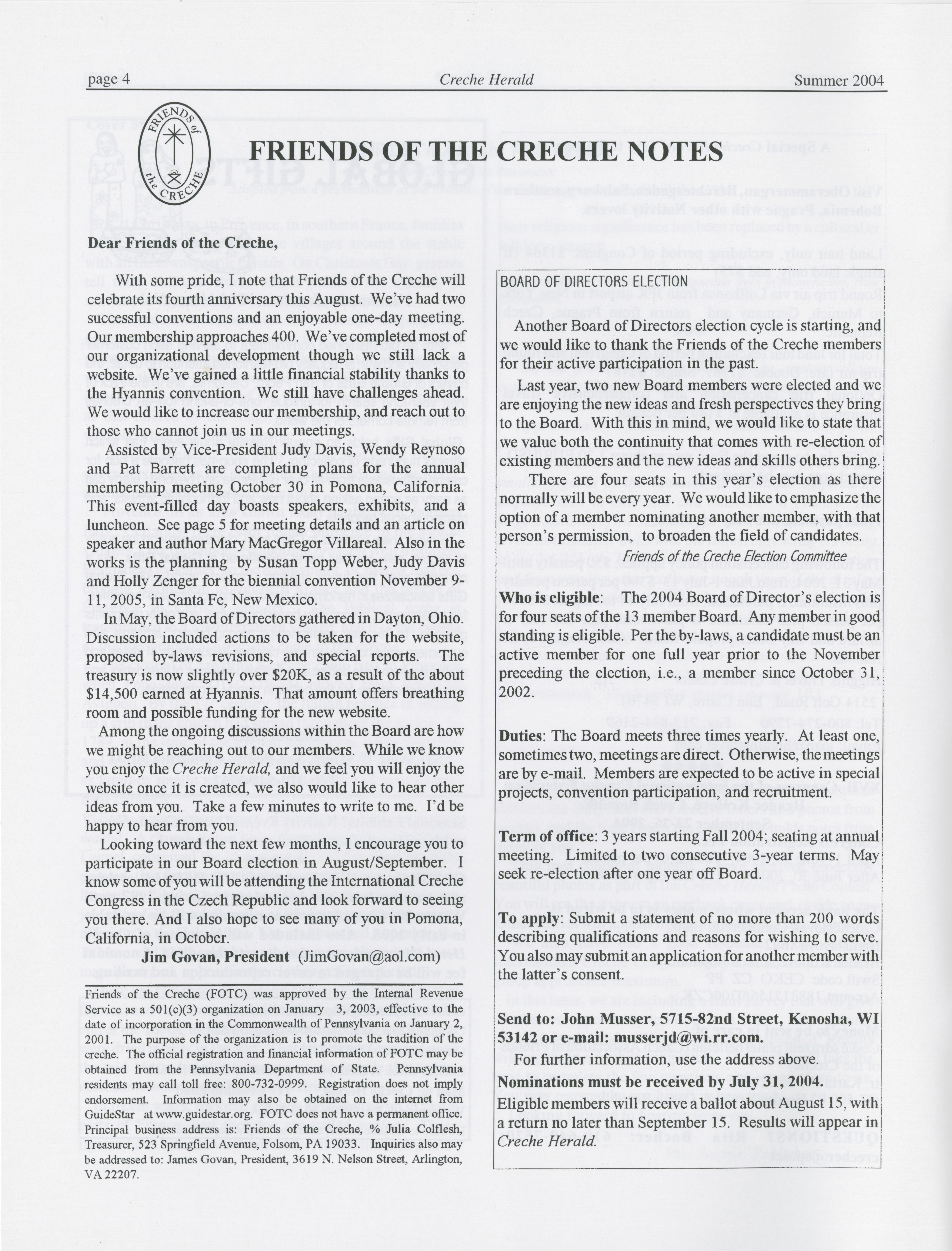 Looking toward the next few months, I encourage you to participate in our Board election in August/September I know some of you will be attending the International Creche Congress in the Czech Republic and look forward to seeing you there And I also hope to see many of you in Pomona, California, in October.