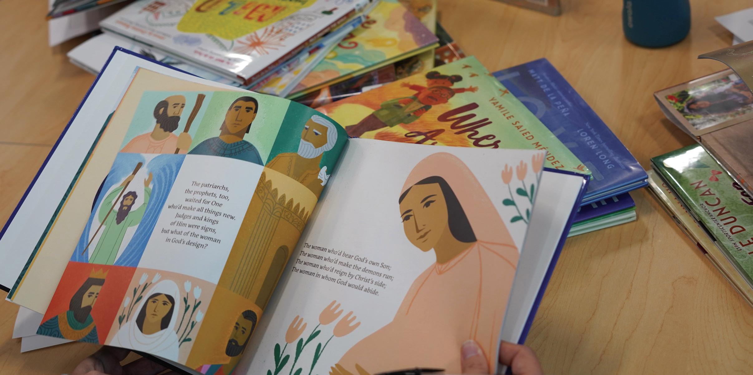 A workshop attendee explores a case of children’s books depicting the Nativity, all arranged according to reading level.
