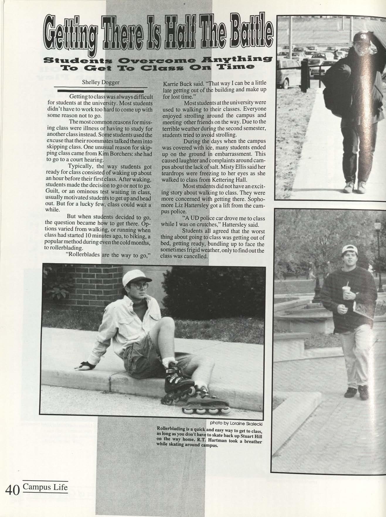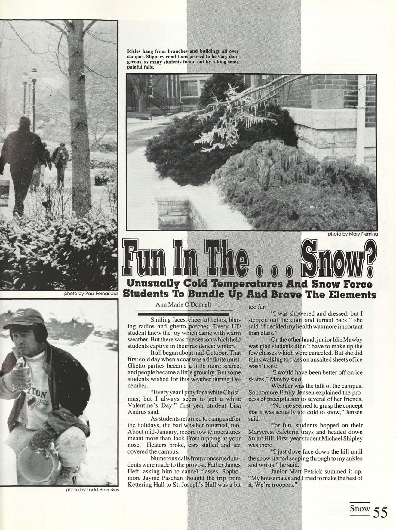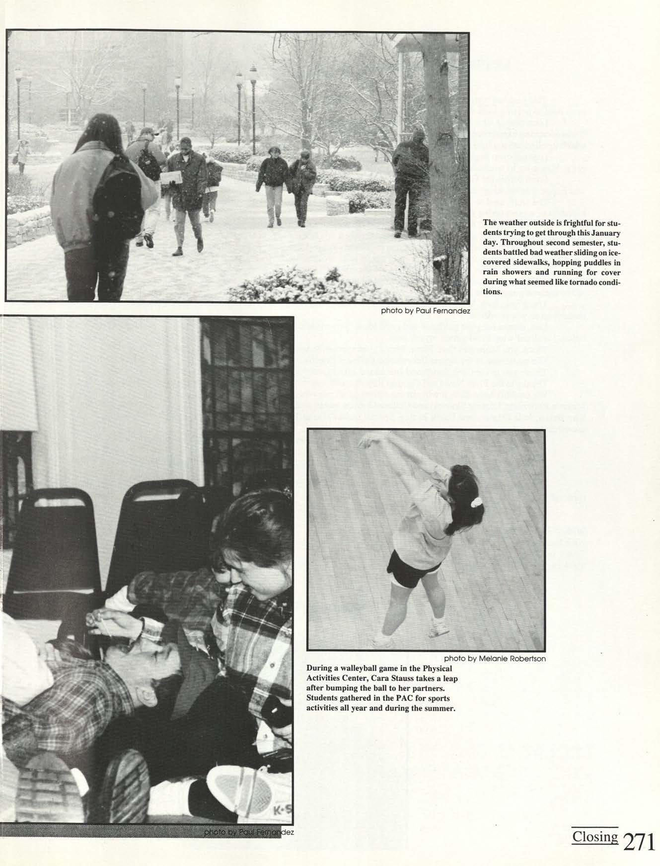 The weather outside is frightful for students trying to get through this January day. Throughout second semester, students battled bad weather sliding on icecovered sidewalks, hopping puddles in rain showers and running for cover during what seemed like tornado conditions.