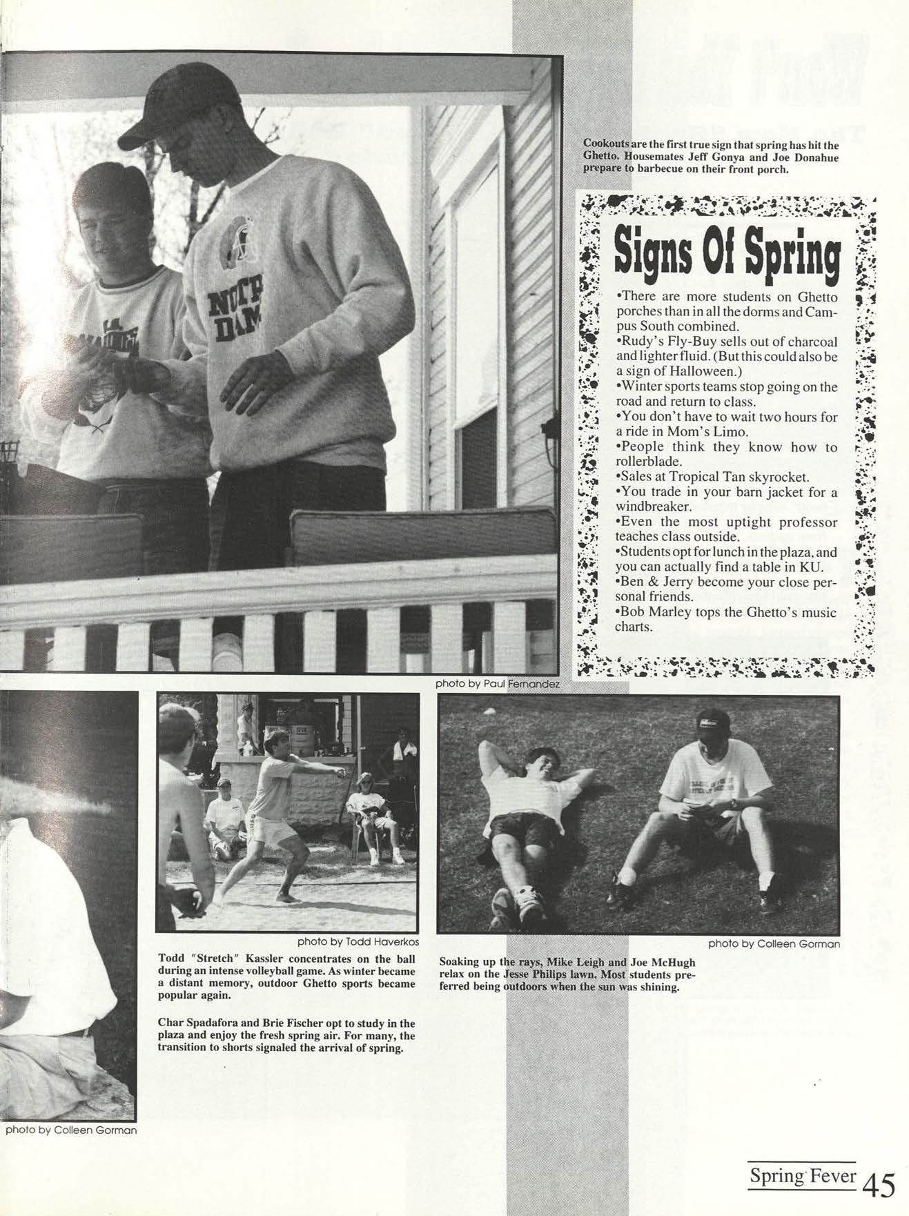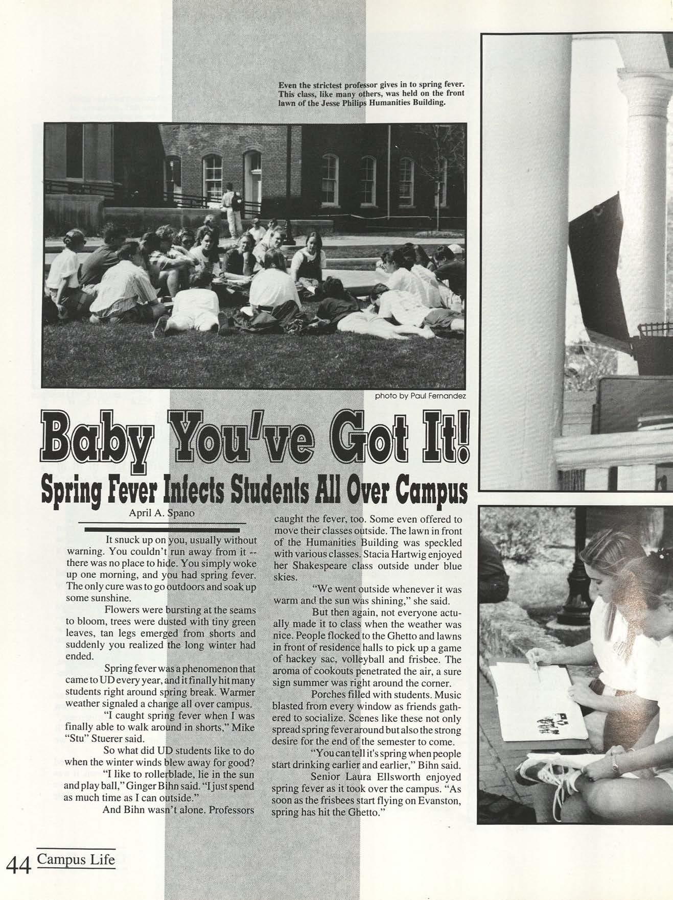 The days ofautumn pass too quickly for students enjoying the outdoors. After a cold winter, spring fever hit many on campus, and despite the ominous snowfall two days before spring break, students kept their hopes up for a good time.