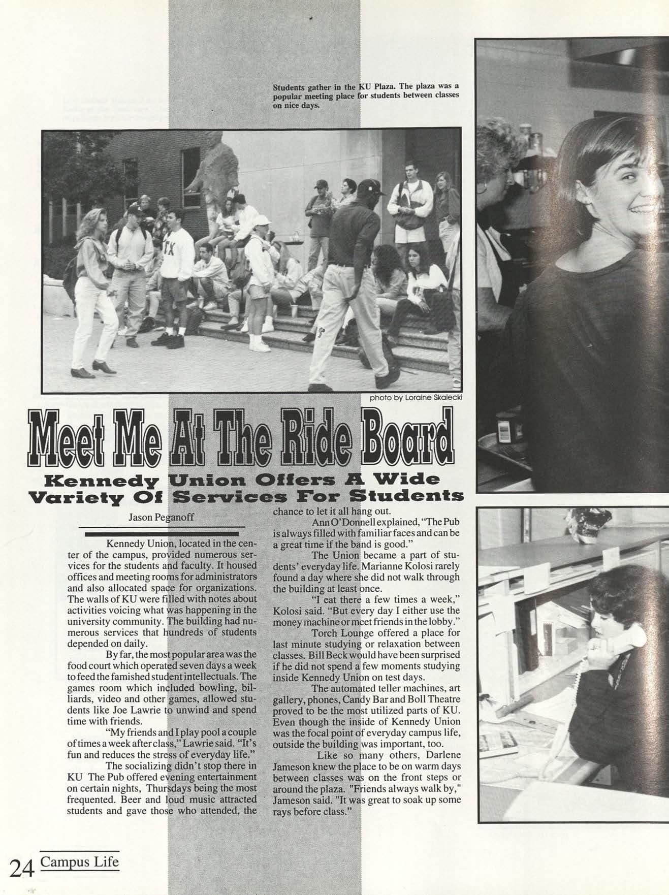 Everv DAY of the week, the campus came to life with the hustle and bustle of students going to class, acting in a play or heading to Kennedy Union to hang out for a while. The campus provided both entertainment and academics for students.