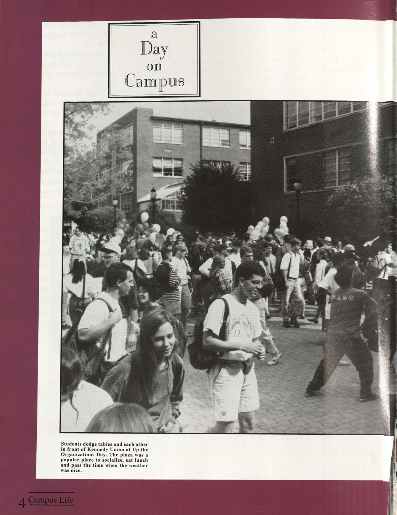 Students dodge tables and each other in front of Kennedy Union at Up the Organizations Day. The plaza was a popular place to socialize, eat lunch and pass the time when the weather was nice.