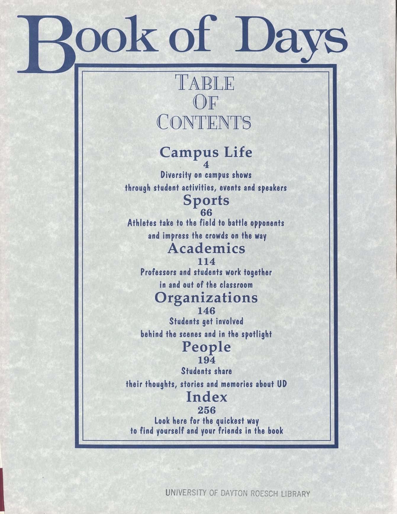 TABLE OJF CONTENTS Campus Life 4 Diversity on campus shows through student activities, events and speakers Sports 66 Athletes take to the field to battle opponents and impress the crowds on the way Academics 114 Professors and students ~ork together in and out of the classroom Organizations 146 Students get involved behind the scenes and in the spotlight People 194 Students share their thoughts, stories and memories about UD Index 256 Look here for the quickest way to find yourself and your friends in the book UNIVERSITY OF DAYTO OESCH L R