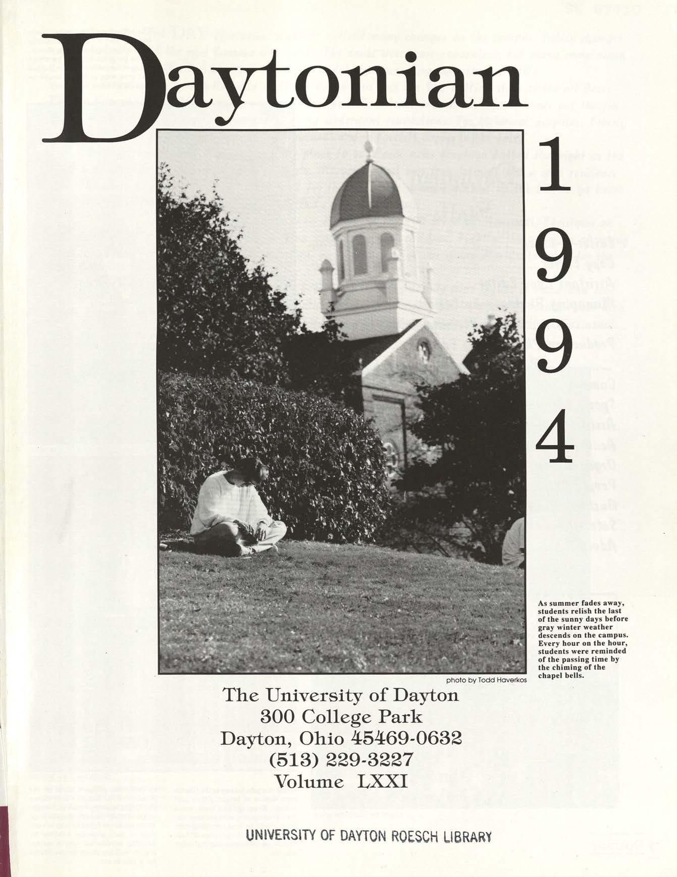 • on1an p hoto by Todd Haverkos The University of Dayton 300 College Park Dayton, Ohio 45469-0632 (513) 229-3227 Volume LXXI UNIVERSITY OF DAYTON ROESCH LIBRAR~ As summer fades away, students relish the last of the sunny days before gray winter weather descends on the campus. Every hour on the hour, students were reminded of the passing time b y the chiming of the chapel bells.