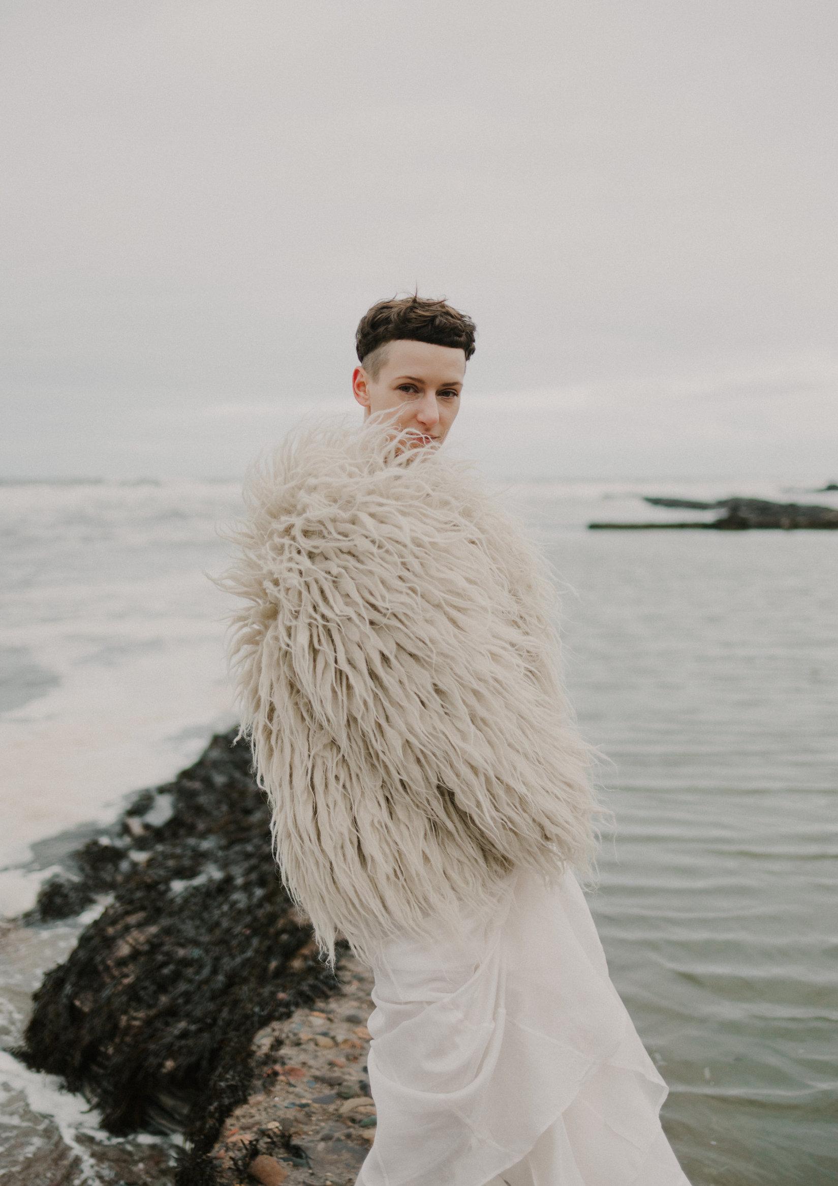 Inevitably, the fabric choice became a crucial factor in my collection. I worked primarily with pure rough woollen tweeds which I combined with smooth silk and synthetic satins. The relationship between these two fabric textures was the foundation of my research. I have created textures through combining these two materials and putting the fabrics through a hightemperature washing process. It resulted in significant shrinkage of wool, whereas satins remained unaffected by the heat, yet were influenced by the change of size and texture of wool. This created ruffling, creasing, and even 3D-textures.