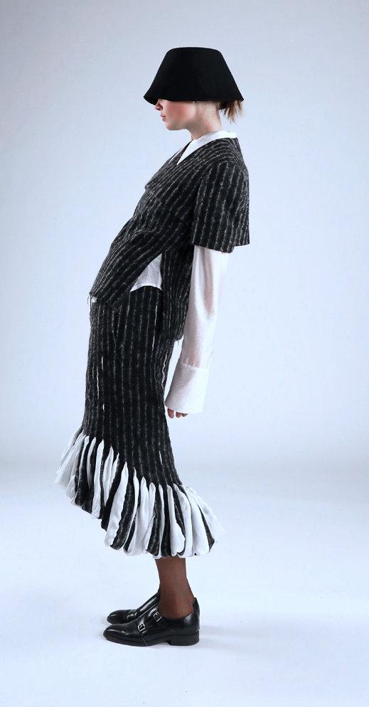 The notion of fabric shrinkage was inspired by Comme des Garçons' F/W 1994 collection, featuring woollen, tailored, and lined garments that were boiled. I was curious whether I would be able to use wool shrinkage as a deliberate method not only for design, but also garment construction.